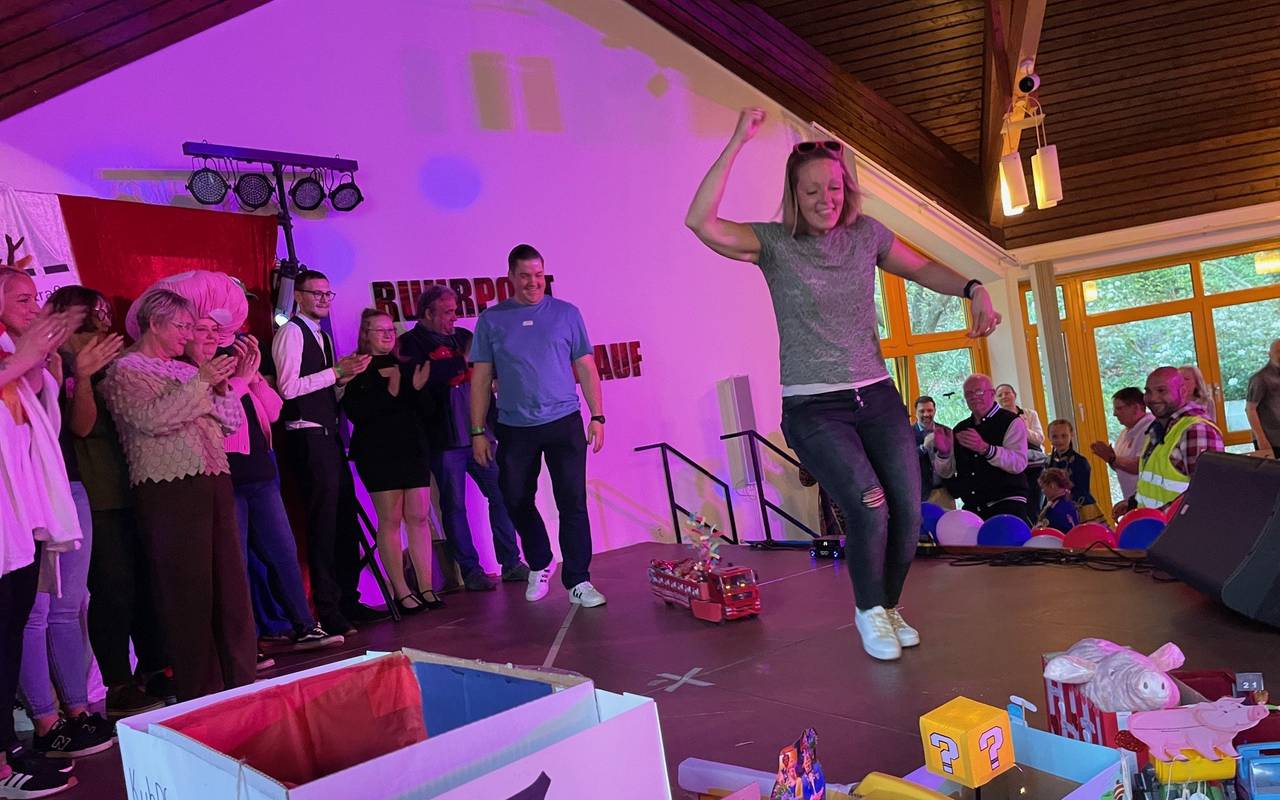 Nach der Absage des Rosenmontagszuges in Kupferdreh wegen einer Bombendrohung in diesem Jahr gab es viel nachzuholen. Alle waren sich einig: die Entscheidung war richtig. Trotzdem war es traurig, nicht nur für die vielen Kinder, die am Rosenmontag vergeblich an der Kupferdreher Str. gewartet hatten. Wenigstens konnten noch die Kamelle und die anderen Süßigkeiten an soziale Einrichtungen verteilt werden. Für die Mini-Ausgabe des Zuges am Samstag (26. April 2025) hatten elf Gesellschaften ihren Prunkwagen nochmal in klein nachgebaut. Befestigt an langen Schnüren wurden sie durch den Saal im Deilbachtal gezogen. Die Stimmung hingegen war riesig. Radio Essen-Stadtreporter Timm Schröder war mittendrin. Vorher hat er noch mit Ideengeber Fabian und Wagenbauer Ulf gesprochen.