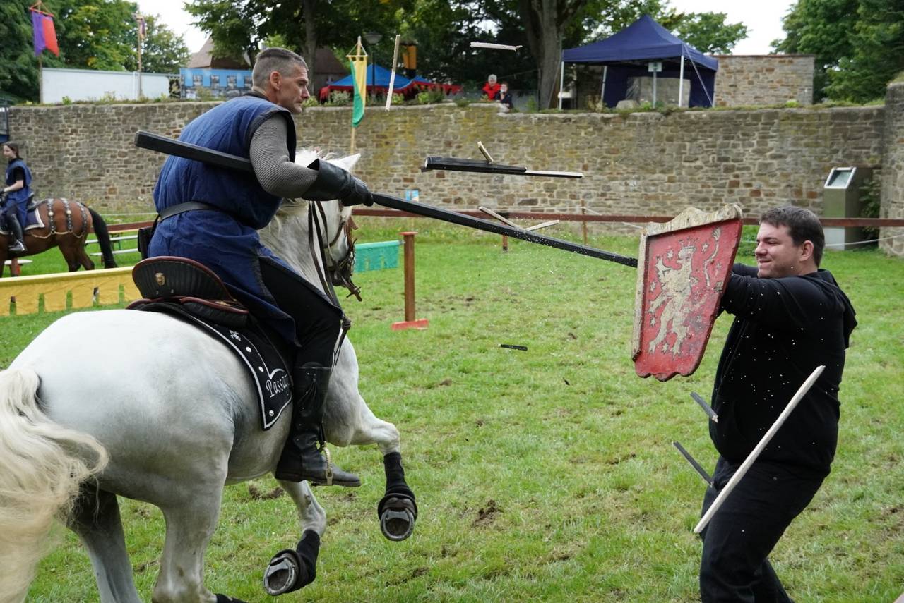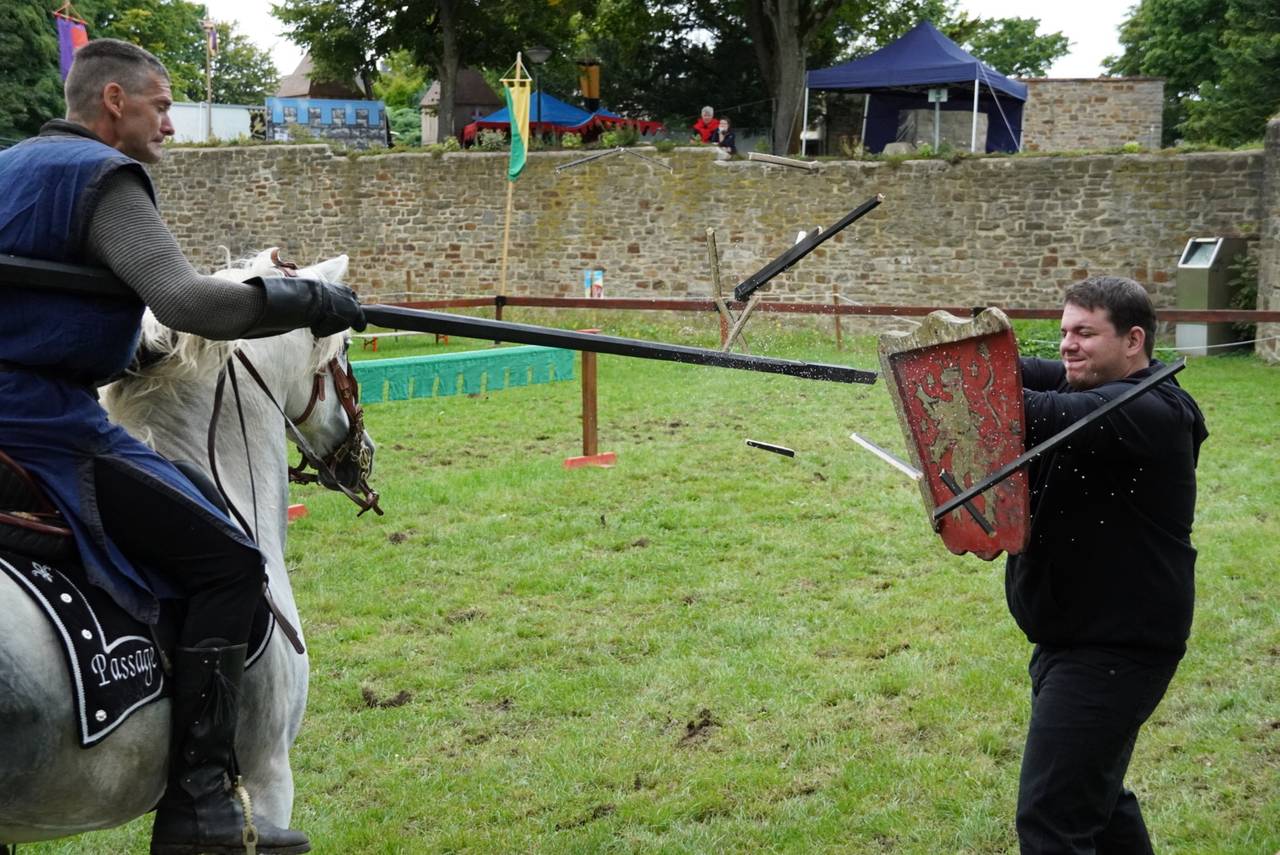 Am Samstag (11.09.) sollte es dann soweit sein: Tobi Bitter stellt sich als Knappe Bitter der Prüfung! Mehrere Ritter und auch eine Amazone versuchen unseren Knappen per Schwert oder Lanze zu Fall zu bringen - schaffen es aber nicht. Sodass aus dem Knappen dann der Ritter Bitter wurde.