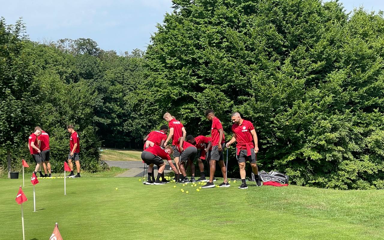 Schnell war der Ehrgeiz auch beim Golfspielen geweckt. Natürlich wurden Wettbewerb untereinander gestartet. Besonders zwischen Routinier Simon Engelmann und Neuzugang Björn Rother ging es beim Spiel um einen Cappuccino heiß her. Am Ende hatte die RWE-Legende das Nachsehen.