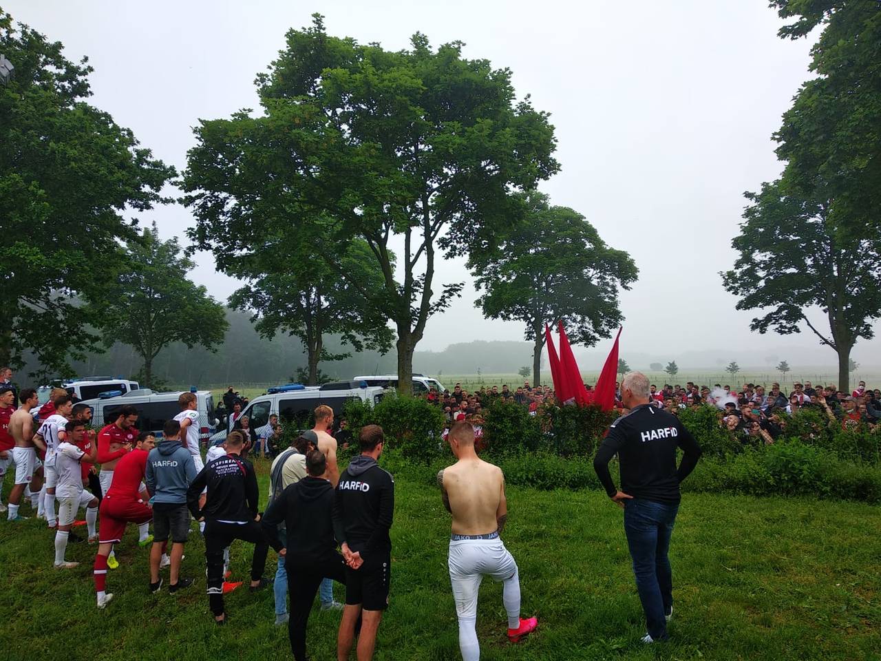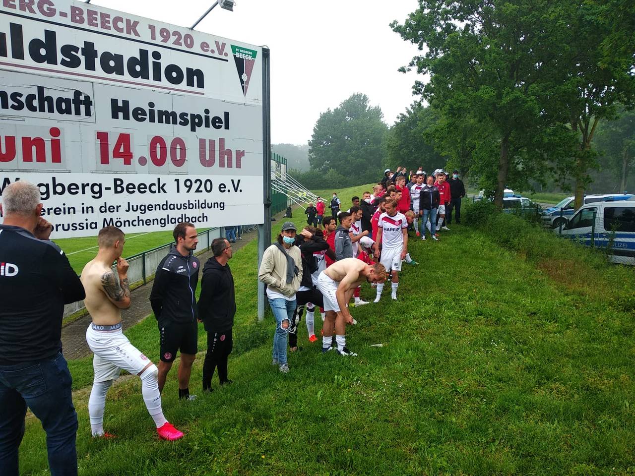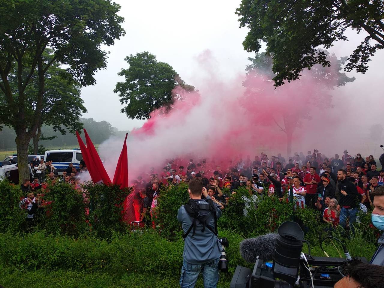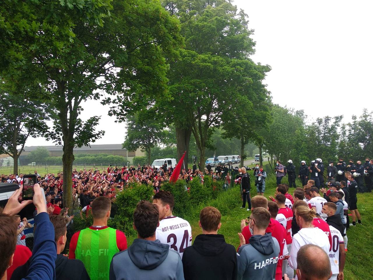 Am Abend warteten die Fans an der Hafenstraße dann auf die Rückkehr der Mannschaft. Viele Fans sind trotz des unglücklichen Ausgangs im Aufstiegsrennen stolz auf ihr Team. Die RWE-Fans wollten den Spielern noch einmal ihren Respekt und ihre Unterstützung zum Ausdruck bringen. Die Polizei hatte das Gelände rund um das Stadion weiträumig abgeriegelt. Es waren erneut knapp 500 Menschen in Bergeborbeck, die die Mannschaft bei der Rückkehr begrüßten.