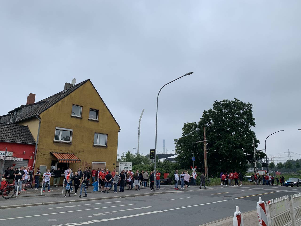 Mehr als 2000 RWE-Fans versammelten sich am Samstagmorgen an der Hafenstraße und sorgten für bundesligareife Stimmung. Sie haben ihre Mannschaft auf dem Weg nach Wegberg-Beek verabschiedet.