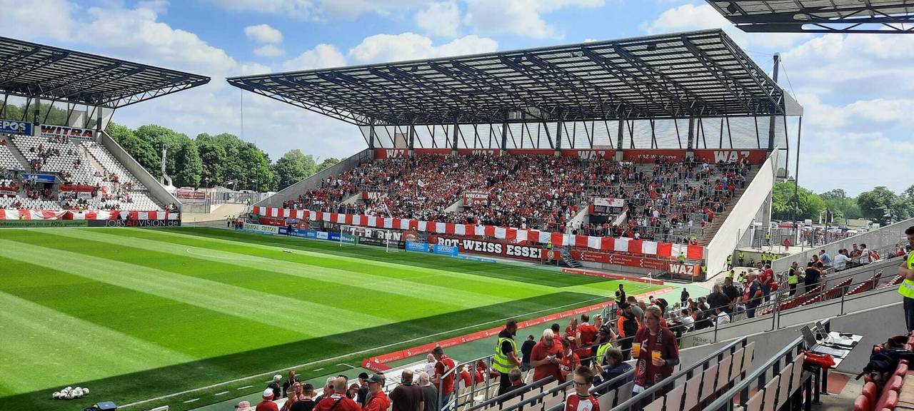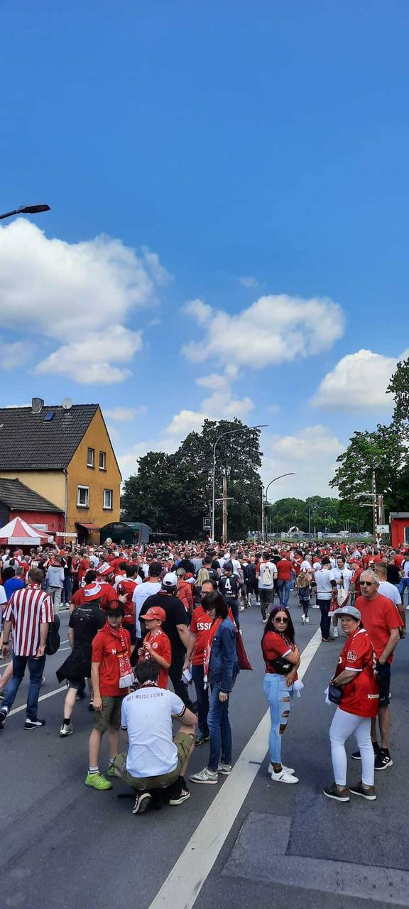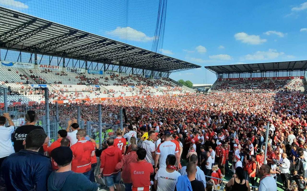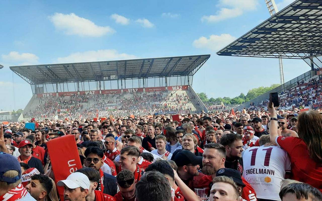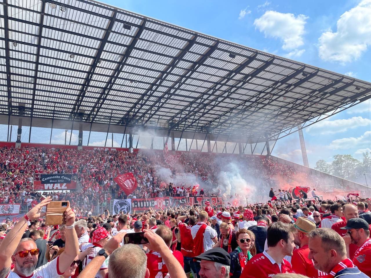 Es war ein spannendes Spiel mit einem positiven Ergebnis: RWE spielt nach 14 Jahren wieder in der 3. Liga! An der Hafenstraße wird gefeiert, Fans stürmen das Fußballfeld und freuen sich für die Spieler und für die Stadt Essen. Die Mannschaft will sich vor den Fans am Abend am Porscheplatz nochmal zeigen. Fangruppen planen auch einen Marsch vom Rheinischen Platz zum Porscheplatz.