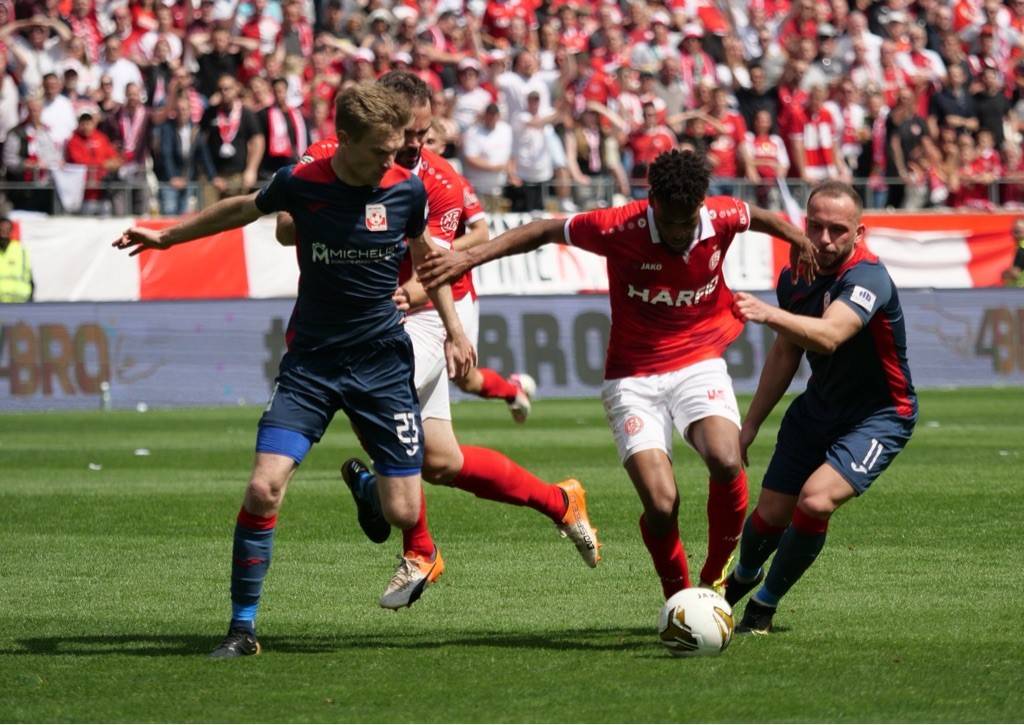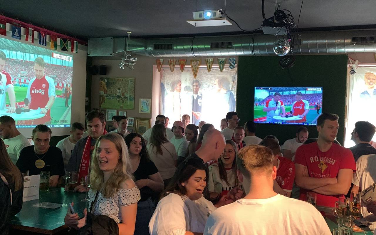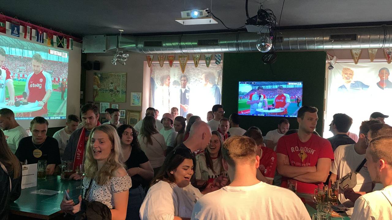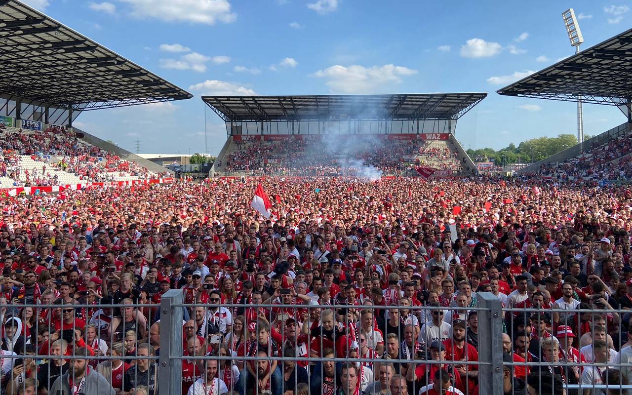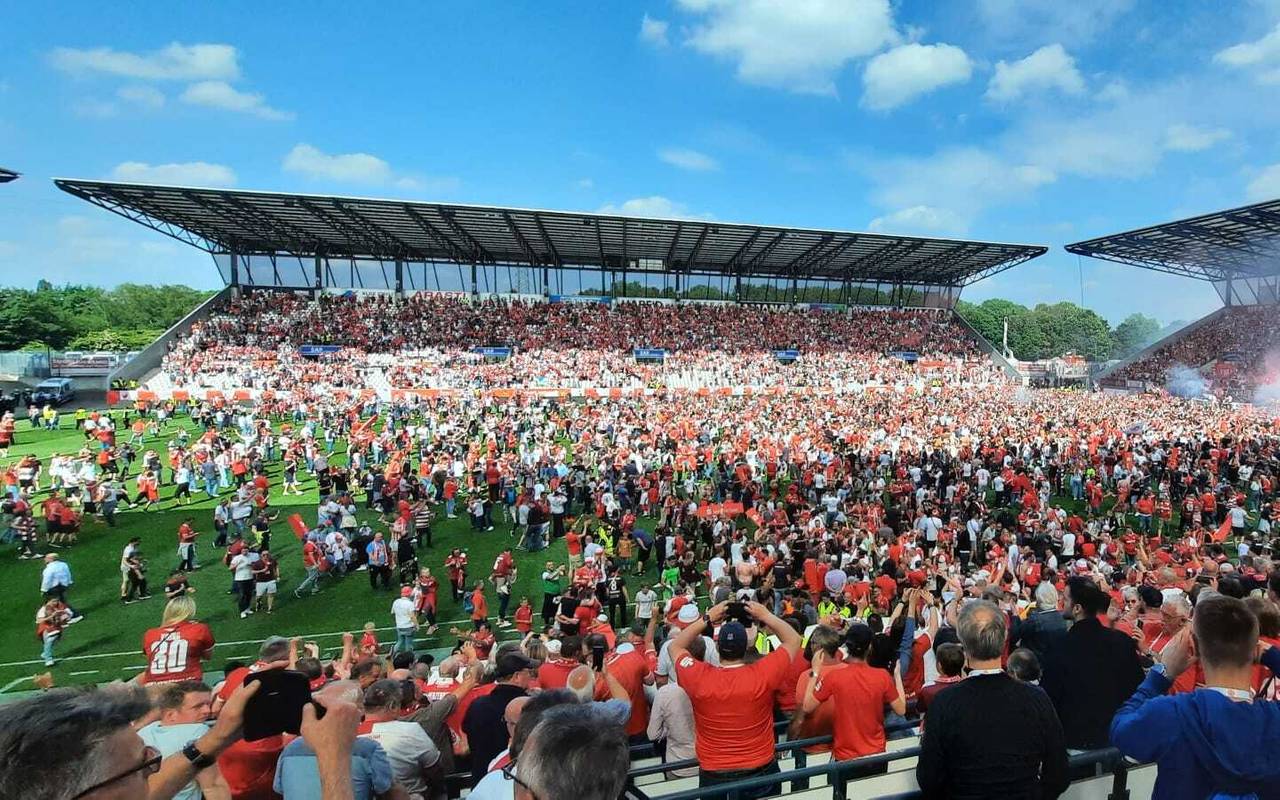 Es war ein spannendes Spiel mit einem positiven Ergebnis: RWE spielt nach 14 Jahren wieder in der 3. Liga! An der Hafenstraße wird gefeiert, Fans stürmen das Fußballfeld und freuen sich für die Spieler und für die Stadt Essen. Die Mannschaft will sich vor den Fans am Abend am Porscheplatz nochmal zeigen. Fangruppen planen auch einen Marsch vom Rheinischen Platz zum Porscheplatz.