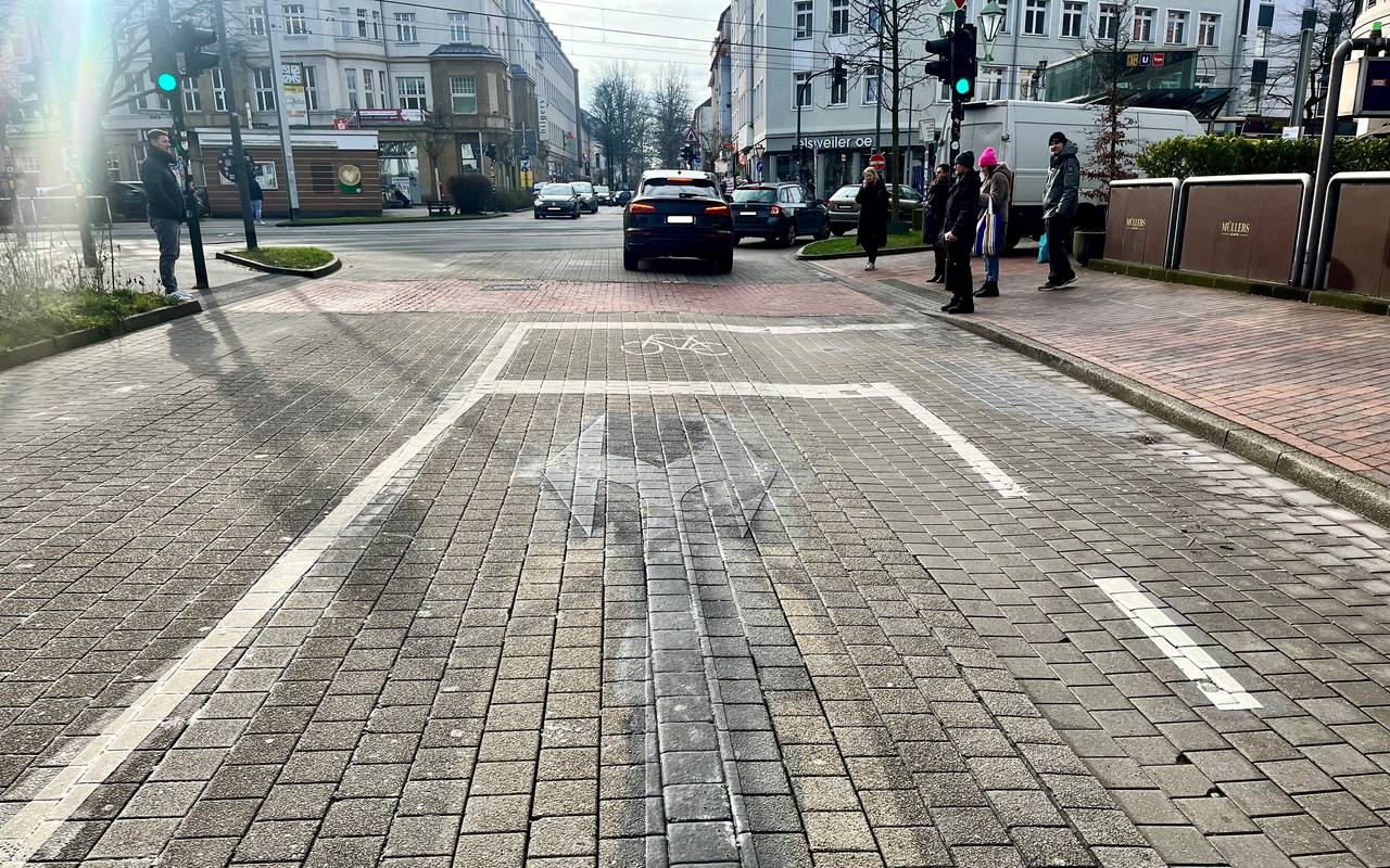 Auf der Rüttenscheider Straße in Essen sind die letzten Spuren des "neuen" Verkehrskonzepts zu sehen. Die Verwirrung ist perfekt.