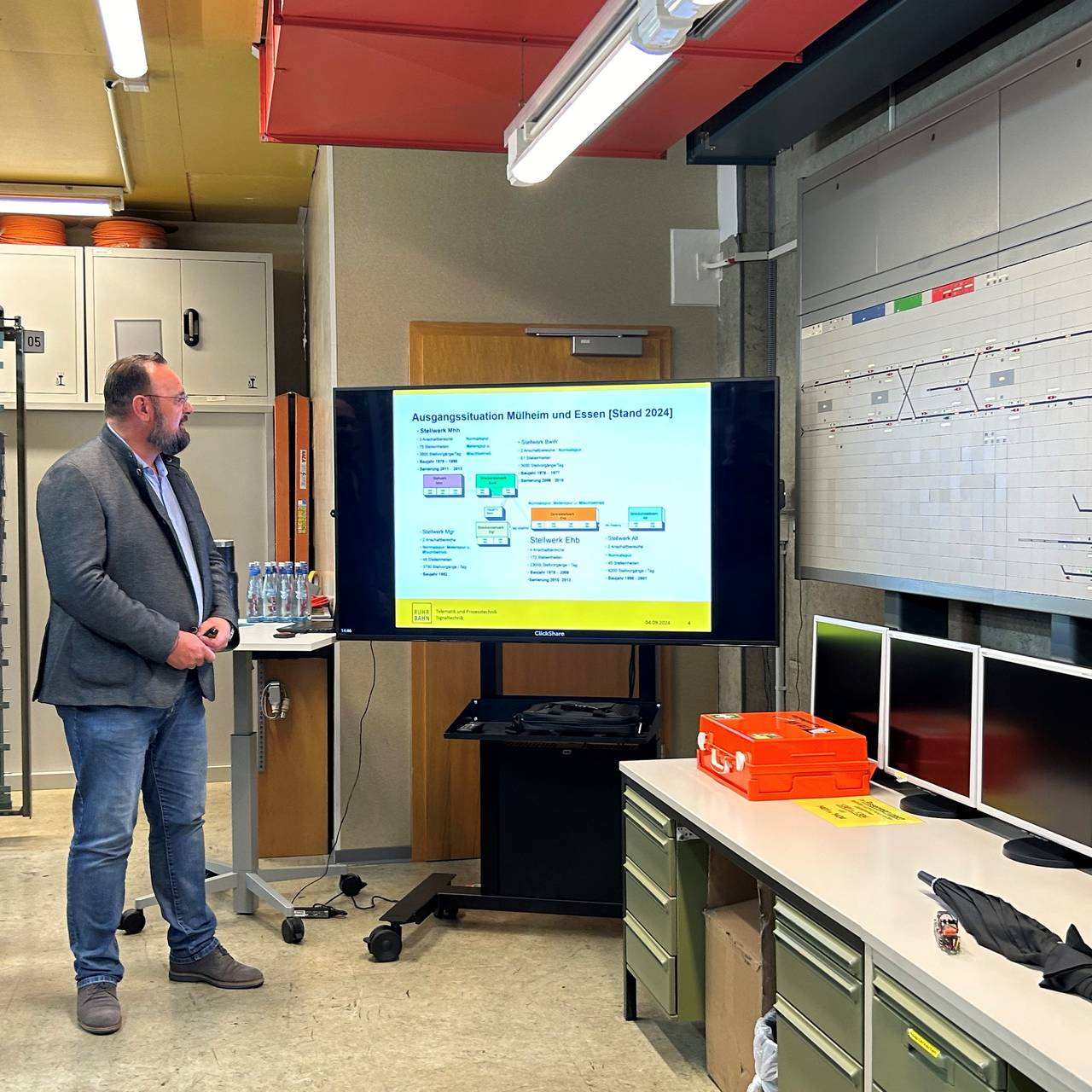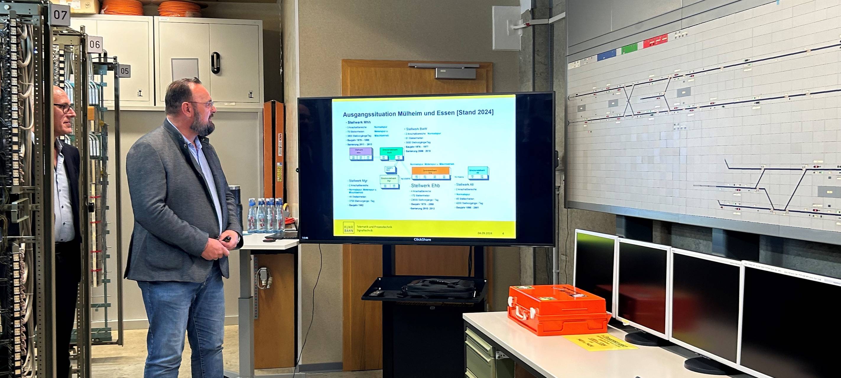 In Essen fahren die Straßenbahnen und U-Bahnen nur, wenn die Relais in den Stellwerken hin und her schalten. Das sind 2 Millionen Schaltspiele im Jahr. In Zukunft wird das anders laufen. Da wird alles über große Serverschränke gesteuert. Im Moment müssen die Informationen aus der analogen Technik noch über eine Schnittstelle an die digitale Technik bei der Ruhrbahn weitergeleitet werden. Wer sich mit Schnittstellen auskennt, weiß, da kann immer mal wieder was hängen bleiben.