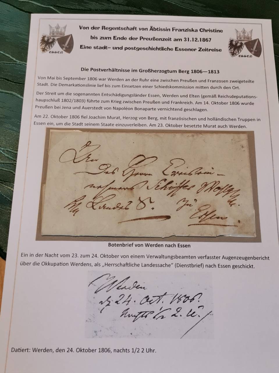 Die Sammlung beinhaltet aber nicht nur internationale Stücke, sondern auch einige Dinge mit Bezug zu Essen. Vor allem unter den Briefen befindet sich so manches Juwel. So zeigt uns Jürgen beispielsweise den frühsten Stempel, welcher auf dem Essener Stadtgebiet verwendet wurde. Außerdem hat er einen Botenbrief aus der napoleonischen Zeit, der ging an den Bürgermeister von Essen und hält fest, dass die Franzosen nun Werden besetzt haben. „Das sind Dokumente, die jedes Museum mit Kusshand nehmen würde“, so Witkowski. So ist Jürgen unter anderem auf die postgeschichtliche Heimatsammlung Essen gestoßen. Die Sammlung beginnt mit Stücken aus dem Jahr 1761 und enthält „Juwelen, die für Essen-Sammler ziemlich wichtig sind.