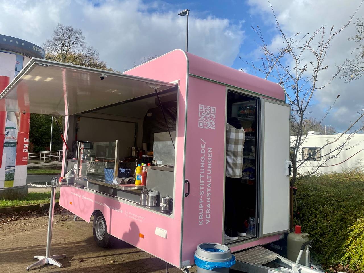 Vor etwa einem Jahr hat sich der ehemalige Betreiber des einzigen Pommes-Wagens auf der Margarethenhöhe zur Ruhe gesetzt. Wer mittags schnell etwas essen wollte, musste nach Holsterhausen, nach Haarzopf oder zum Bredeneyer Kreuz fahren, um Pommes, Currywurst oder andere für das Ruhrgebiet typische Snacks zu bekommen. Seit November ist der rosa Wagen wochentags ab 11 Uhr geöffnet. Am Wochenende steht der Imbisswagen neben der Villa Hügel. Hier halten Handwerker in der Pause an, Nachbarn von der Margarethenhöhe kommen schnell mal rüber gelaufen, auch die Studenten aus dem Wohnheim haben es nicht weit.