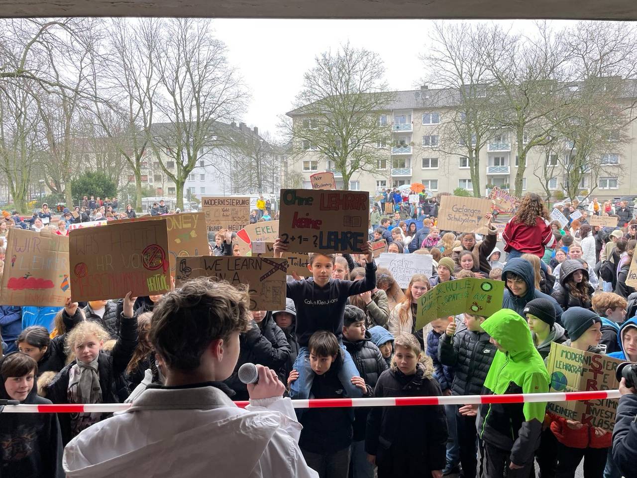 Am Mittwoch (13. März) haben Schülerinnen und Schüler in Essen sich für eine bessere Bildungspolitik eingesetzt. Die landesweiten Proteste wurden von der Vertretung der LandesschülerInnen organisiert. Dabei fordern Kinder und Jugendliche der Schulen mehr Lehrkräfte, modernere Bildungsmethoden und intakte Schulgebäude. Seit Jahren ist der Zustand der Schulen in Essen ein Thema und Problem. Jetzt setzen sich die Schülerinnen und Schüler für zeitnahe Veränderungen ein, damit das Problem mehr Aufmerksamkeit bekommt.