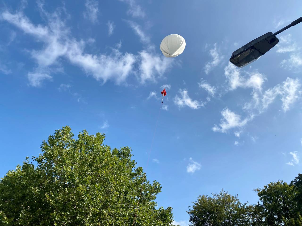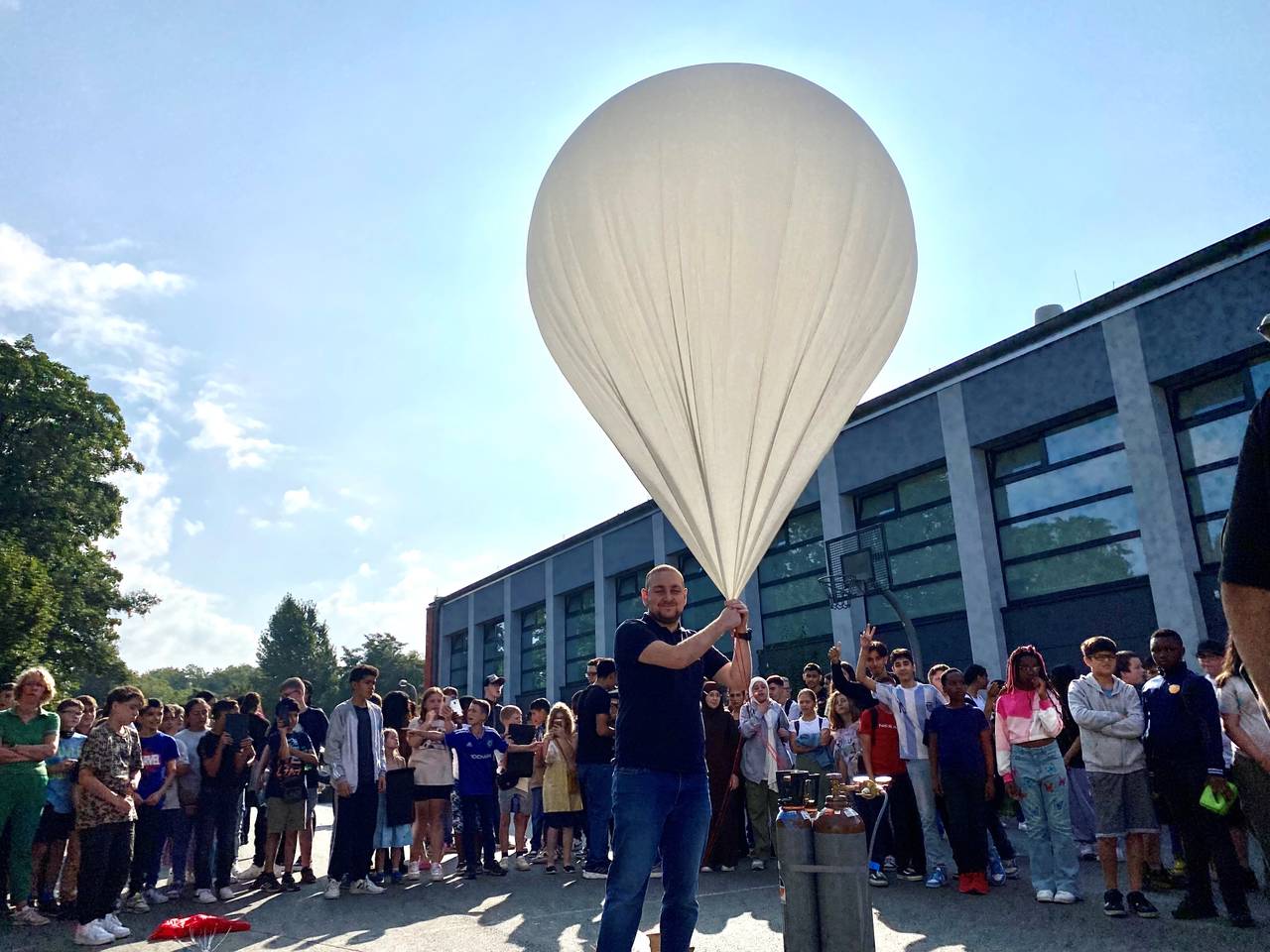 Beim Start hier auf der Erde hat er drei Meter Durchmesser, nach etwa 40 Kilometern sind es schon 15 Meter Durchmesser. Dann platzt der Ballon und die Sonde mit den Kameras landet mit einem Fallschirm auf der Erde. Irgendwo, einige hundert Kilometer von Altenessen entfernt, wird er dann eingesammelt. Ein Team fährt mit dem Auto hinterher und bekommt regelmäßig ein GPS-Signal vom Ballon. Abhängig vom Wind wird die Sonde vermutlich im Bereich von Paderborn landen. In der Vergangenheit war das Einsammeln schon mal komplizierter. Da musste der Ballon vom Baum oder sogar aus einem Gefängnis geholt werden.
