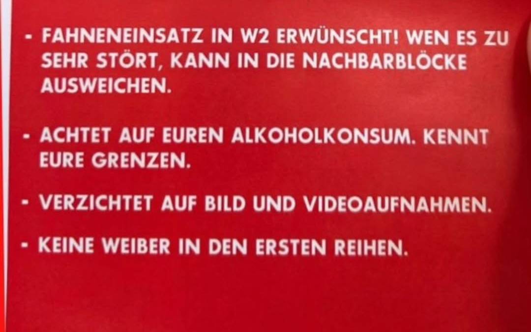 "Keine Weiber in den ersten Reihen" - das steht auf Flyern, die am Sonntagabend (2. November) beim Spiel von Rot-Weiss Essen gegen Schweinfurt im Stadion verteilt wurden, im Stehplatzbereich W2. Wahrscheinlich kommen sie aus der Szene der Ultras. In den Sozialen Medien regen sich viele auf und sagen unter anderem: Wenn die Frauen nicht da wären, wäre das Stadion nur halb so voll. Einige RWE-Fans haben sich auch bei Radio Essen gemeldet. Sie finden die Flyer diskriminierend und sehen sie als ein "Armutszeugnis für den Verein".