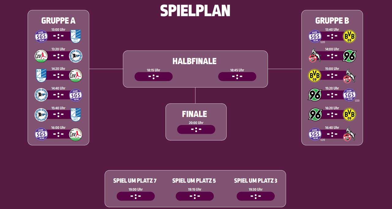 Das Turnier startet um 13 Uhr, Anpfiff im Finale ist um 20 Uhr. Gespielt werden zwei mal 12 Minuten mit sechs gegen sechs. Das Kunstrasenfeld ist 46x26 Meter groß. Im Gegensatz zu den Nationalmannschaften bei der WM ist das Kleinfeld für die SGS natürlich Neuland. Jeder Spieler wird überall auf dem Feld zu finden sein, am Ball gibt es kaum Zeit, das ist ganz schön kraftraubend. Trotzdem soll der Spaß natürlich nicht zu kurz kommen. Außerdem gibt es die Möglichkeit, auch mal ein bisschen was auszuprobieren, sagt Mittelfeldspielerin Beke Sterner: