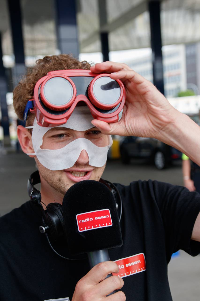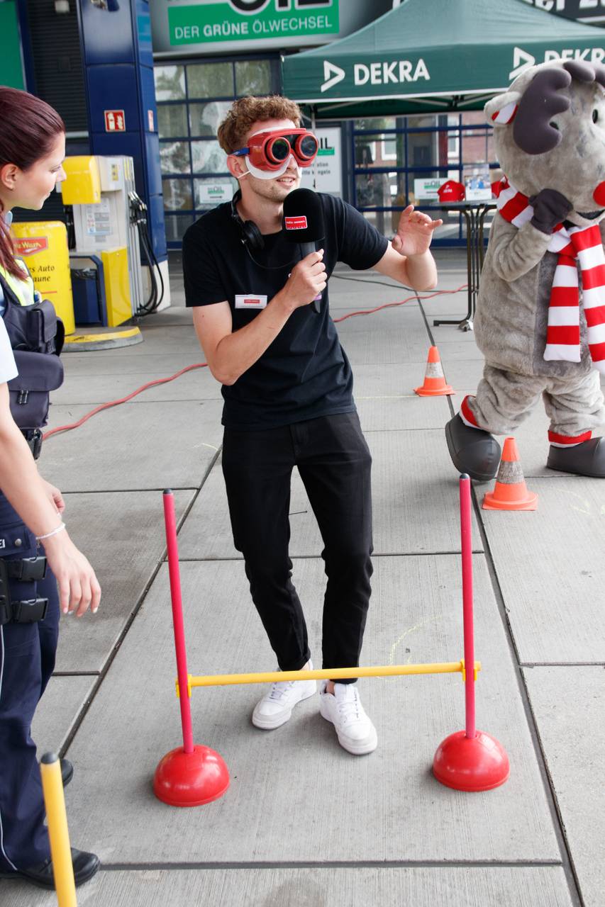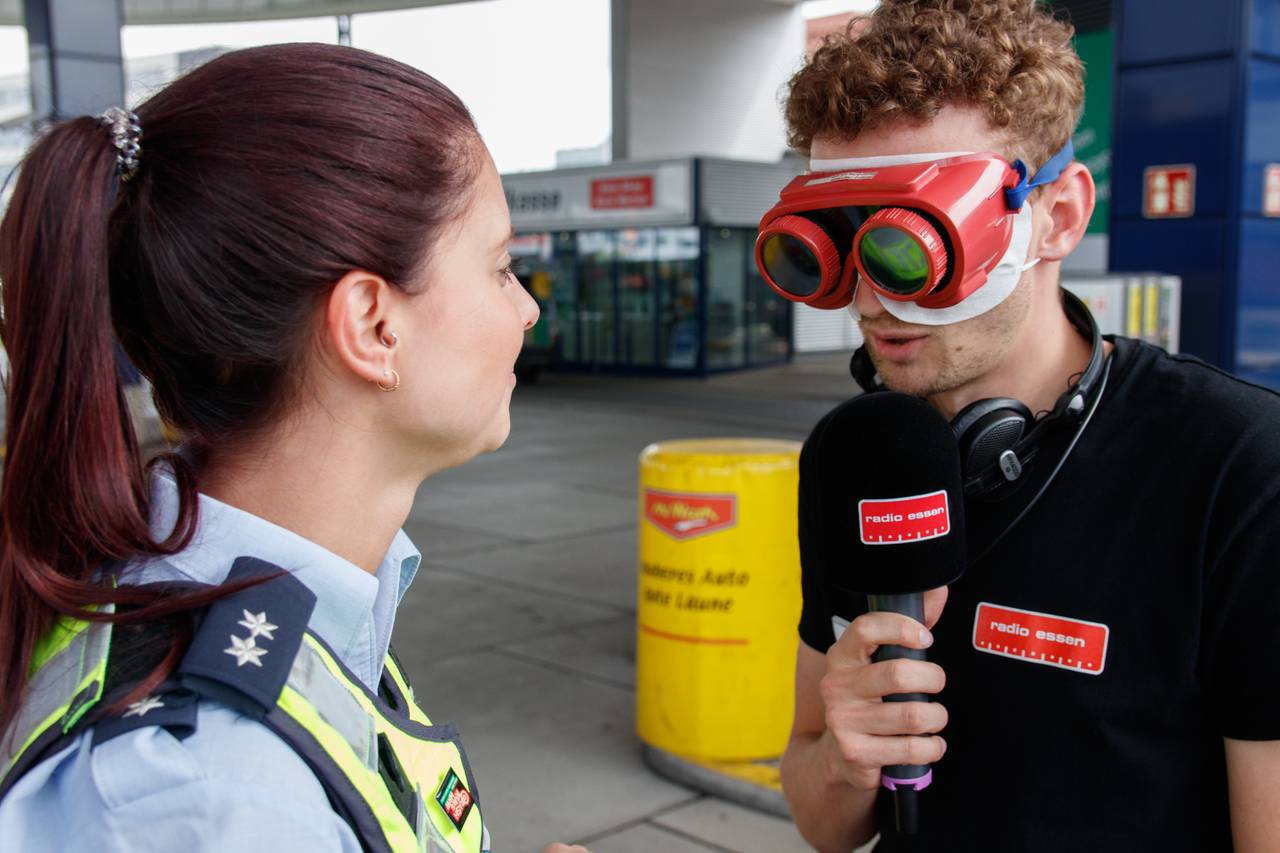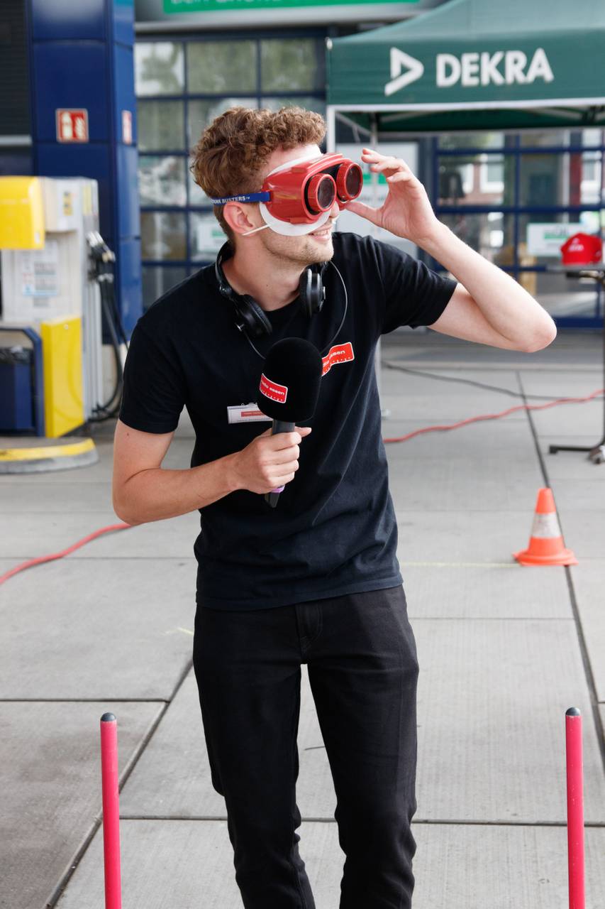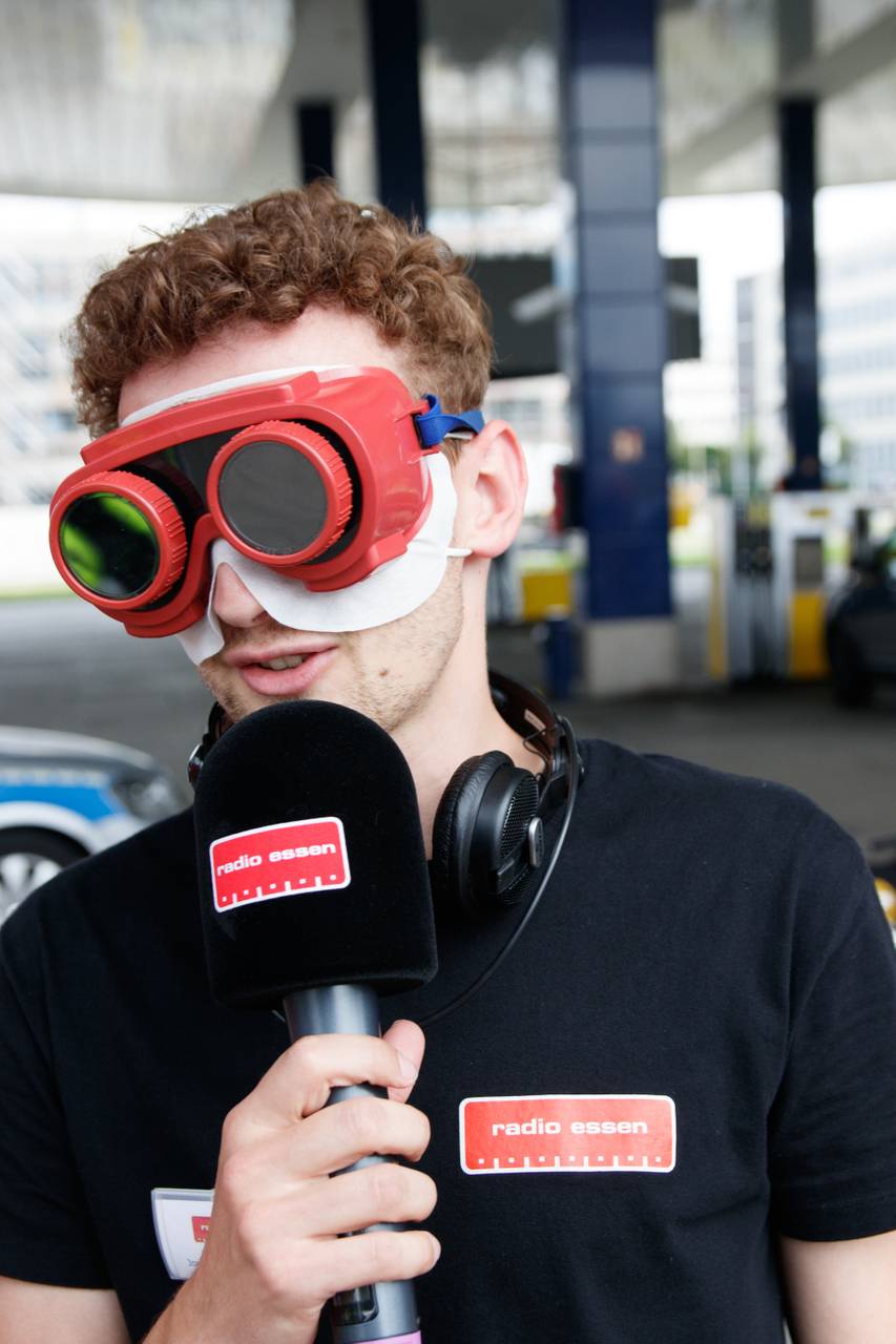 Neben der kostenlosen Autowäsche gab es auch Action beim Radio Essen-Verkehrsmeldertag. Mit der Unterstützung der DEKRA haben wir Euch testen lassen, wie es sich anfühlt, wenn ein Auto sich überschlägt. In einem Überschlagsimulator konnten sich unsere Verkehrsmelderinnen und Verkehrsmelder auf den Kopf drehen lassen. Michael aus dem Westviertel findet, dass der Simulator eine gute Abschreckung ist. Seine Kinder finden es besser als Achterbahn fahren. Außerdem hat die Polizei Essen einen Parcours aufgebaut. Der sah zwar einfach aus, musste aber mit einer bestimmten Brille durchlaufen werden. Die simuliert, wie es sich anfühlt, wenn man Alkohol getrunken hat.