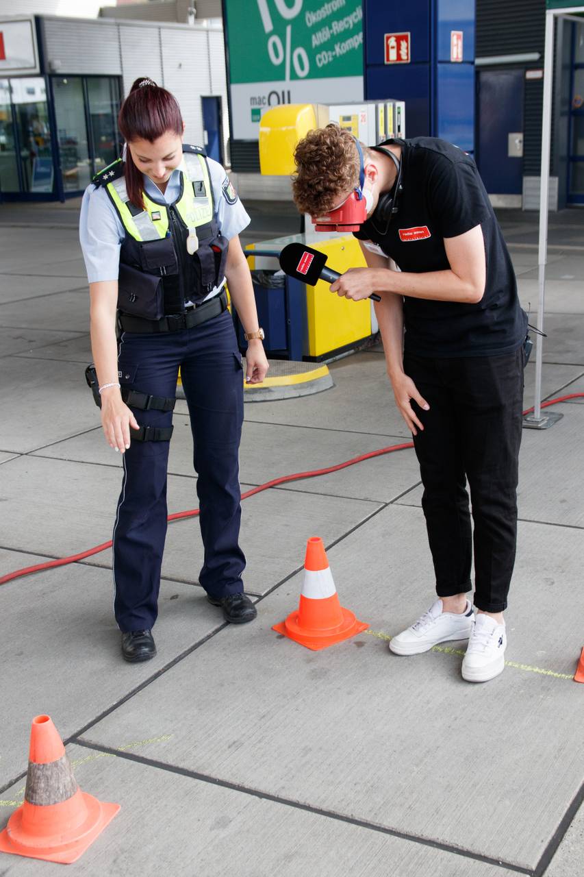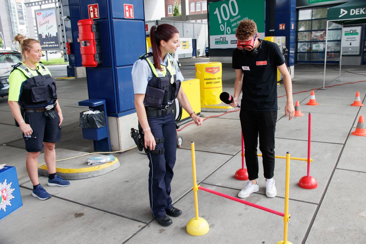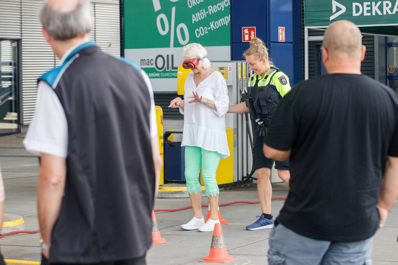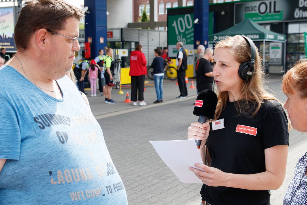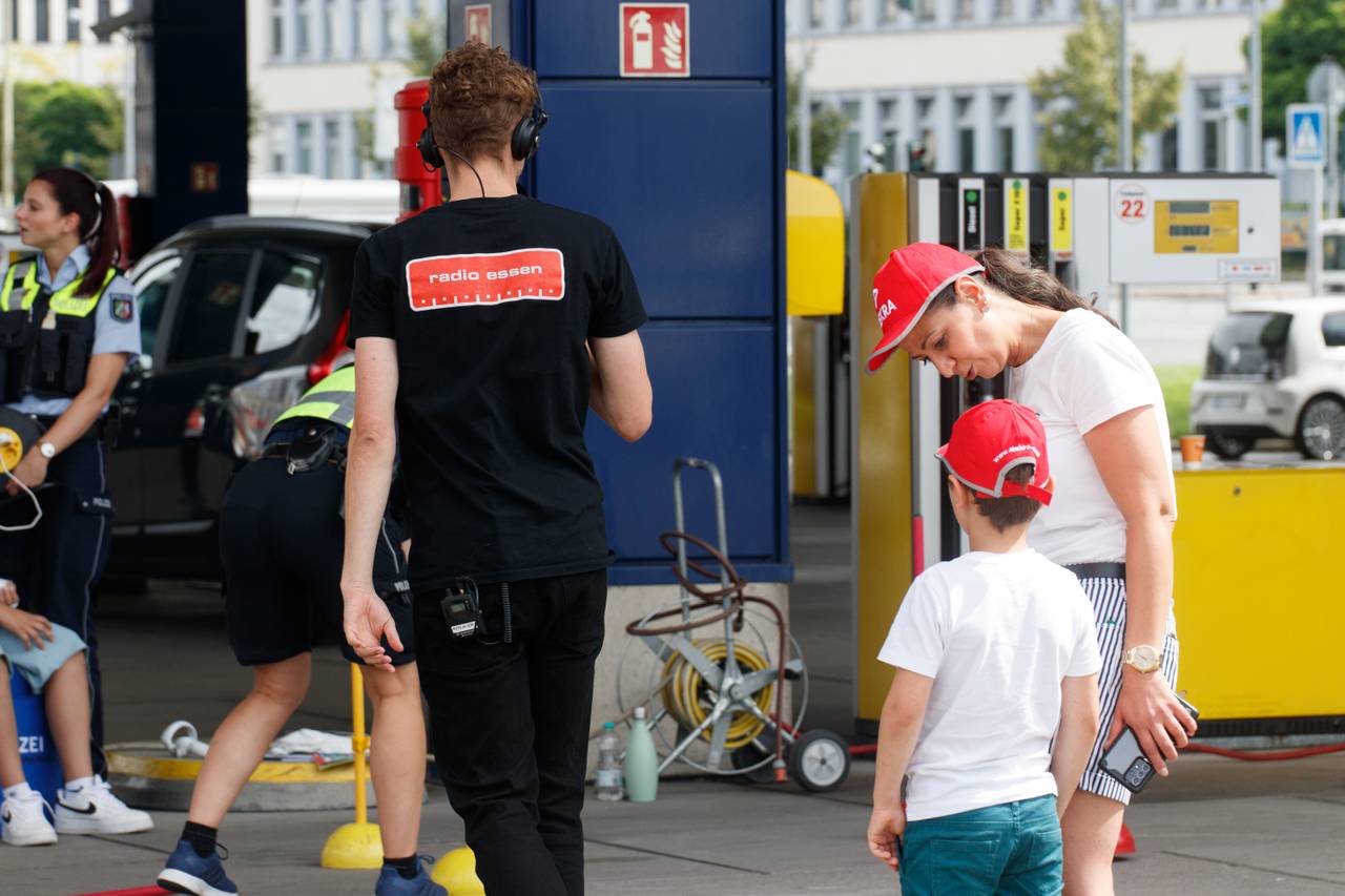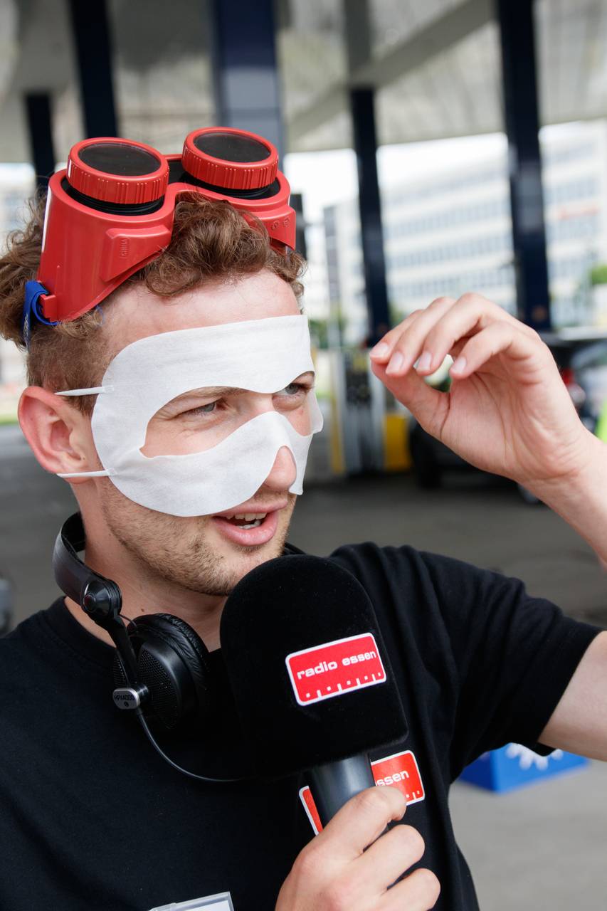 Neben der kostenlosen Autowäsche gab es auch Action beim Radio Essen-Verkehrsmeldertag. Mit der Unterstützung der DEKRA haben wir Euch testen lassen, wie es sich anfühlt, wenn ein Auto sich überschlägt. In einem Überschlagsimulator konnten sich unsere Verkehrsmelderinnen und Verkehrsmelder auf den Kopf drehen lassen. Michael aus dem Westviertel findet, dass der Simulator eine gute Abschreckung ist. Seine Kinder finden es besser als Achterbahn fahren. Außerdem hat die Polizei Essen einen Parcours aufgebaut. Der sah zwar einfach aus, musste aber mit einer bestimmten Brille durchlaufen werden. Die simuliert, wie es sich anfühlt, wenn man Alkohol getrunken hat.