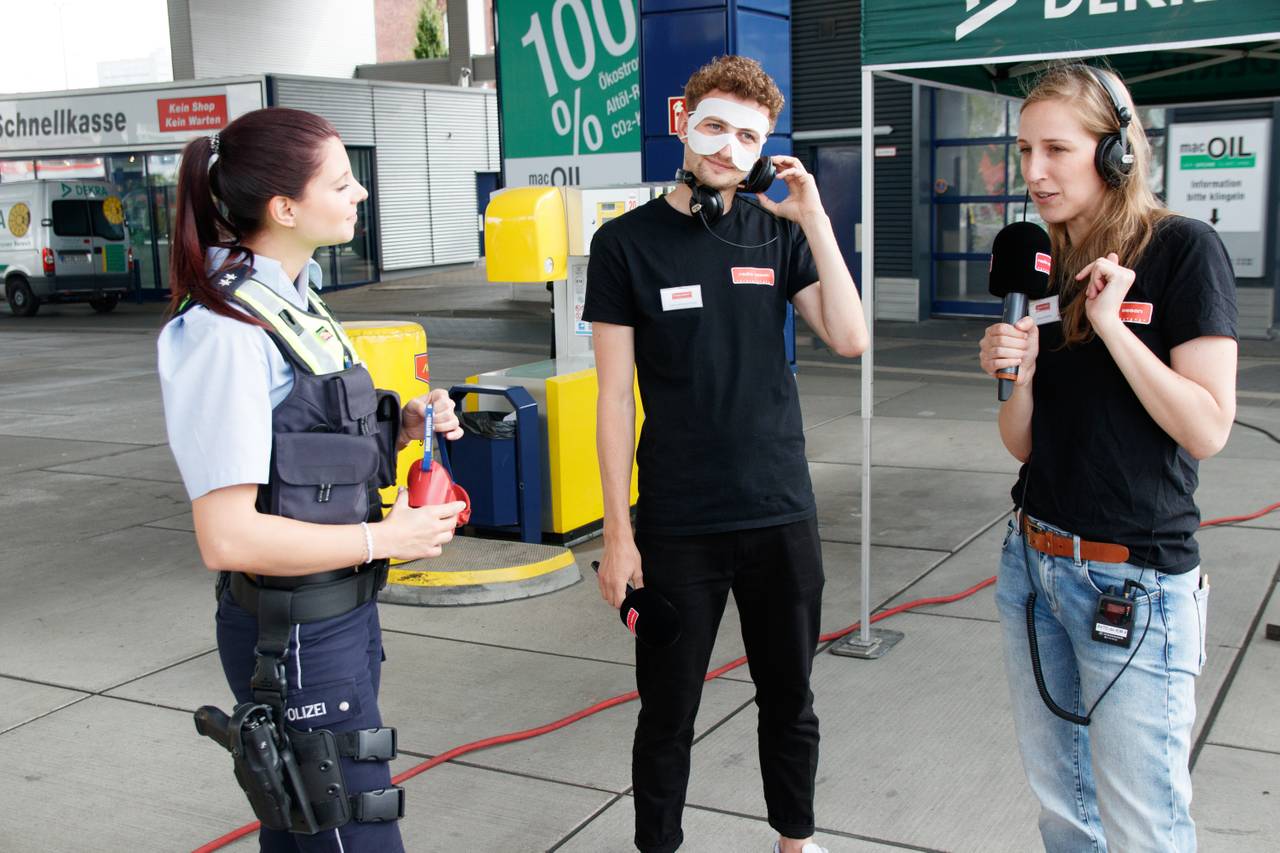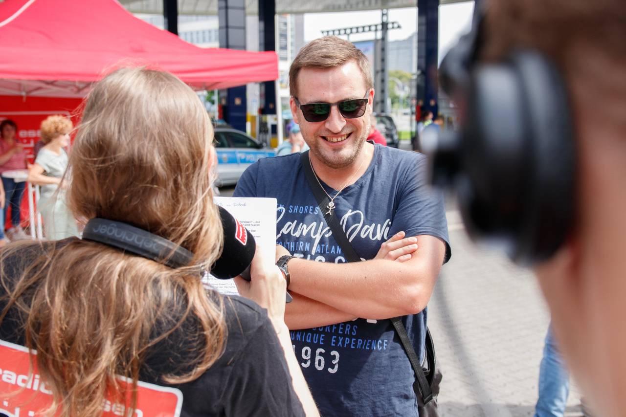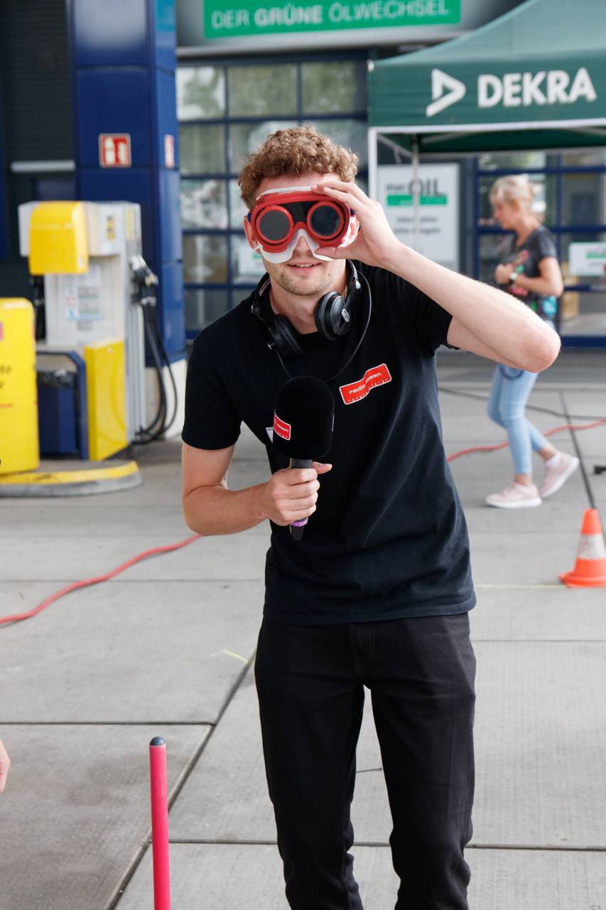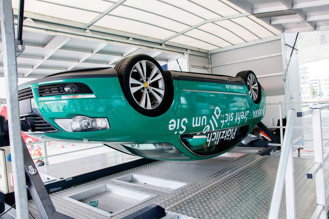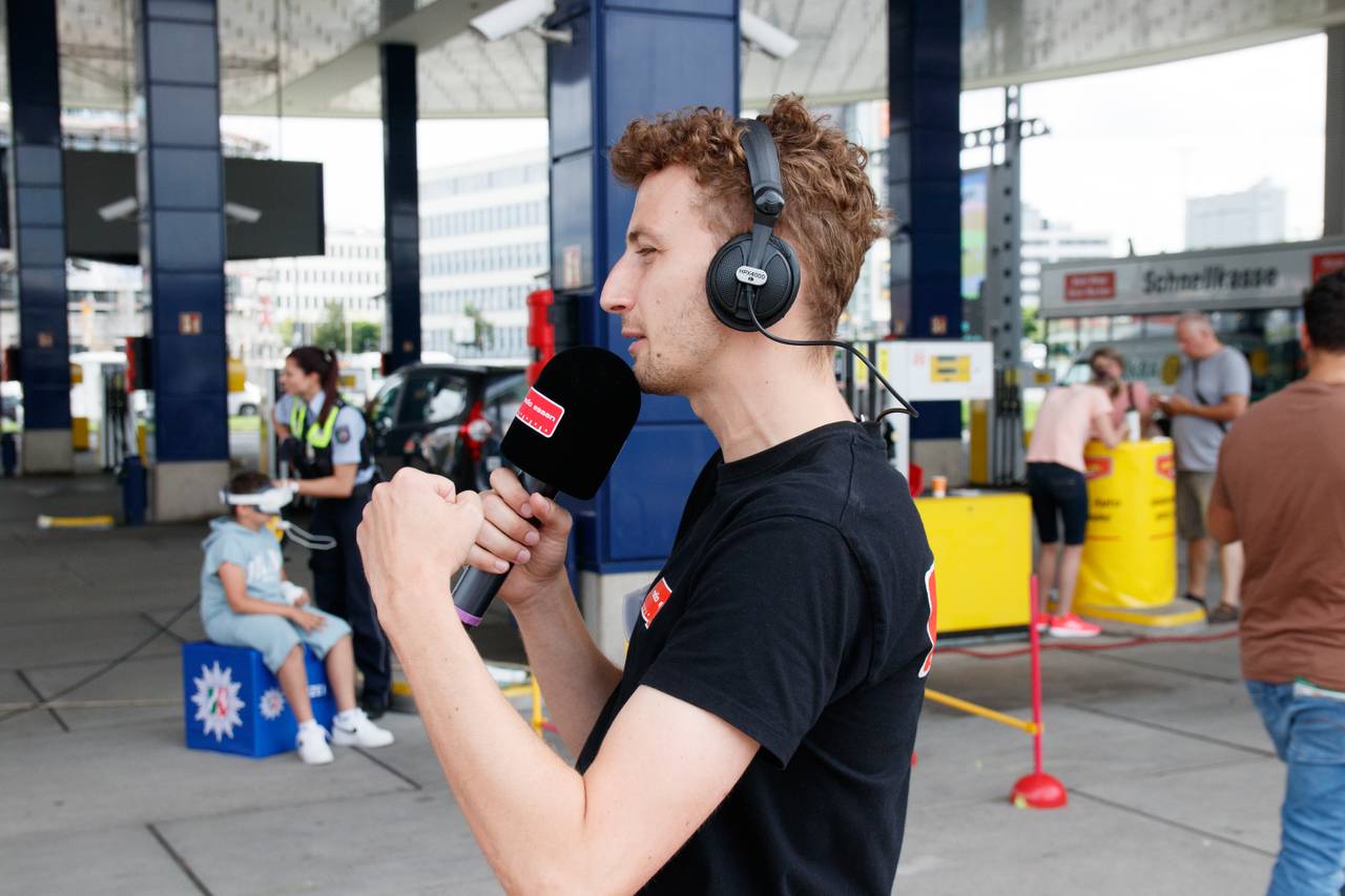 Neben der kostenlosen Autowäsche gab es auch Action beim Radio Essen-Verkehrsmeldertag. Mit der Unterstützung der DEKRA haben wir Euch testen lassen, wie es sich anfühlt, wenn ein Auto sich überschlägt. In einem Überschlagsimulator konnten sich unsere Verkehrsmelderinnen und Verkehrsmelder auf den Kopf drehen lassen. Michael aus dem Westviertel findet, dass der Simulator eine gute Abschreckung ist. Seine Kinder finden es besser als Achterbahn fahren. Außerdem hat die Polizei Essen einen Parcours aufgebaut. Der sah zwar einfach aus, musste aber mit einer bestimmten Brille durchlaufen werden. Die simuliert, wie es sich anfühlt, wenn man Alkohol getrunken hat.