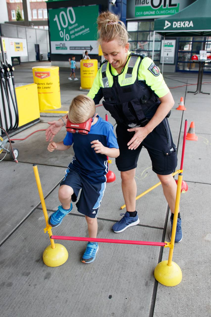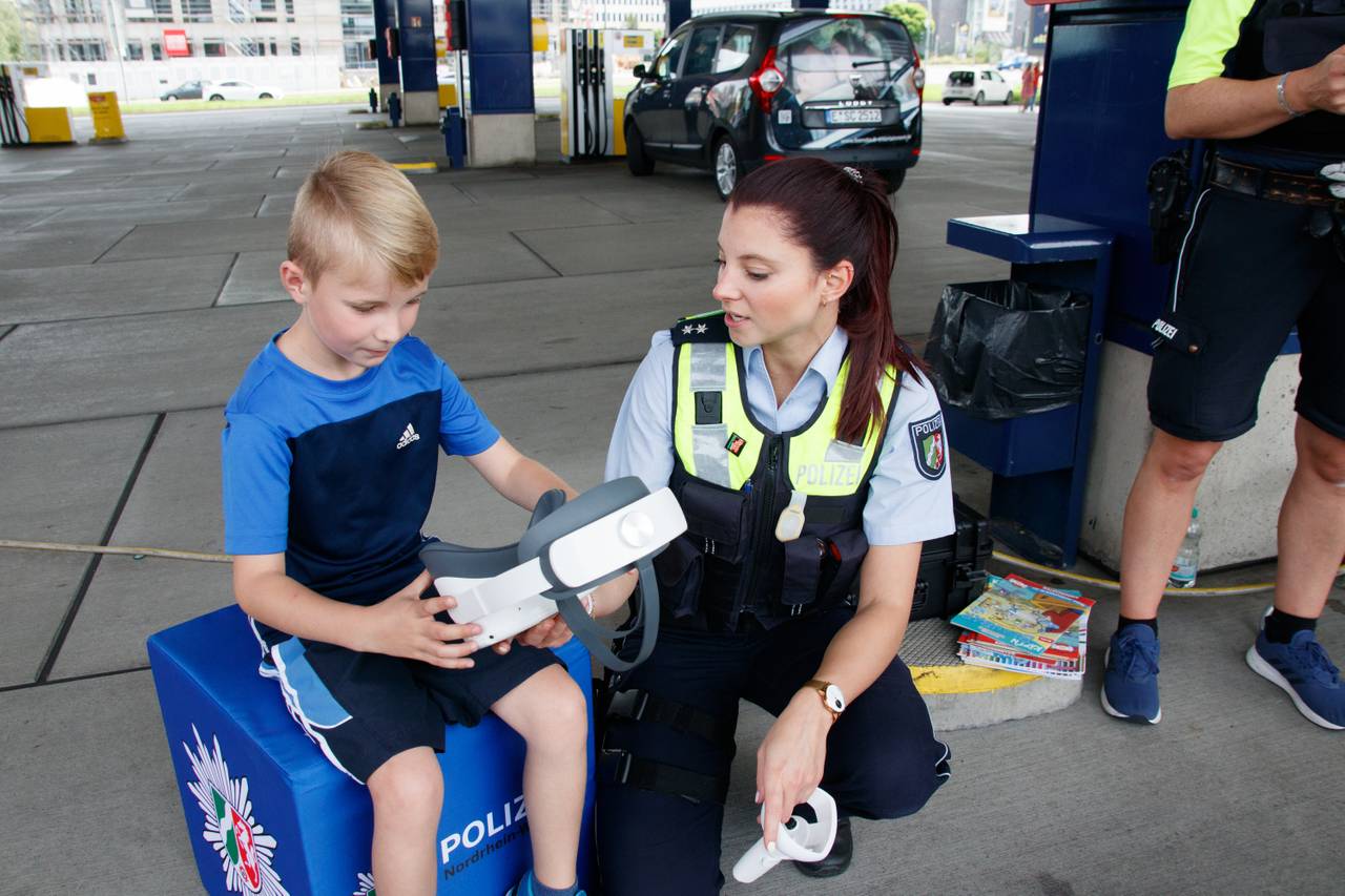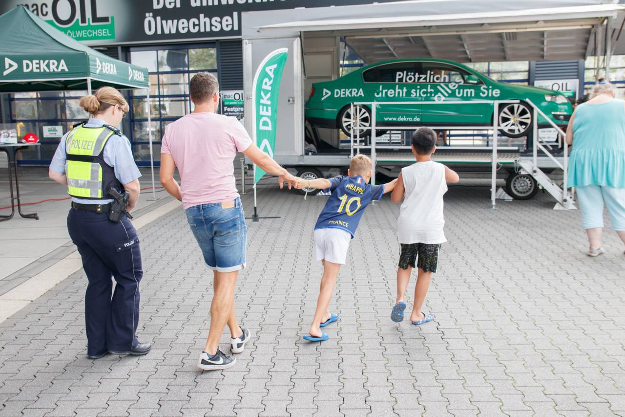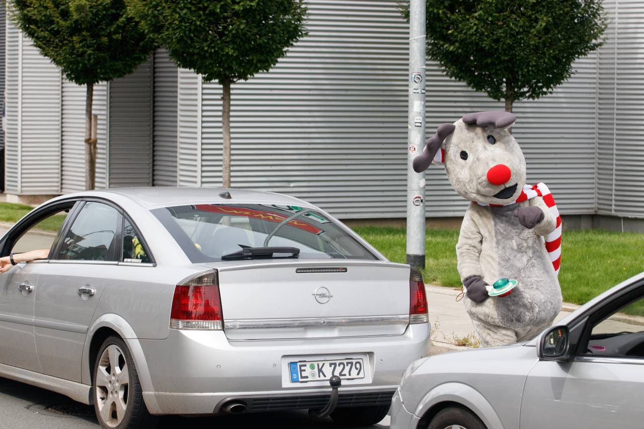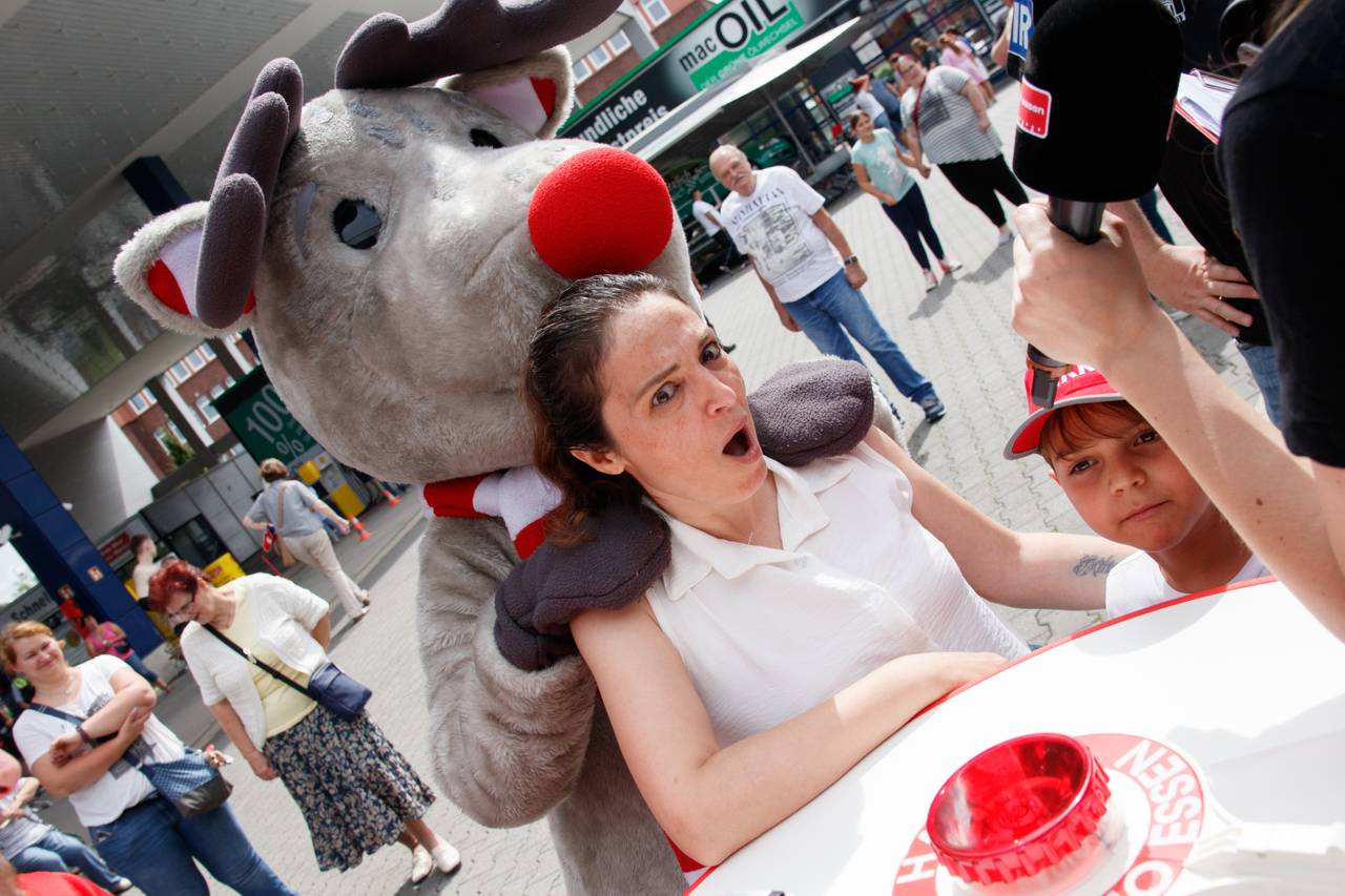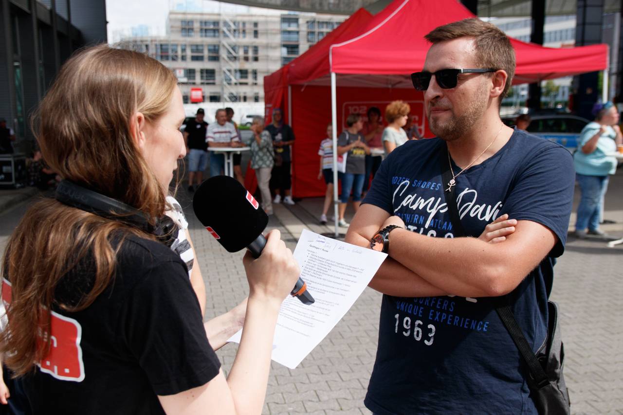 Neben der kostenlosen Autowäsche gab es auch Action beim Radio Essen-Verkehrsmeldertag. Mit der Unterstützung der DEKRA haben wir Euch testen lassen, wie es sich anfühlt, wenn ein Auto sich überschlägt. In einem Überschlagsimulator konnten sich unsere Verkehrsmelderinnen und Verkehrsmelder auf den Kopf drehen lassen. Michael aus dem Westviertel findet, dass der Simulator eine gute Abschreckung ist. Seine Kinder finden es besser als Achterbahn fahren. Außerdem hat die Polizei Essen einen Parcours aufgebaut. Der sah zwar einfach aus, musste aber mit einer bestimmten Brille durchlaufen werden. Die simuliert, wie es sich anfühlt, wenn man Alkohol getrunken hat.