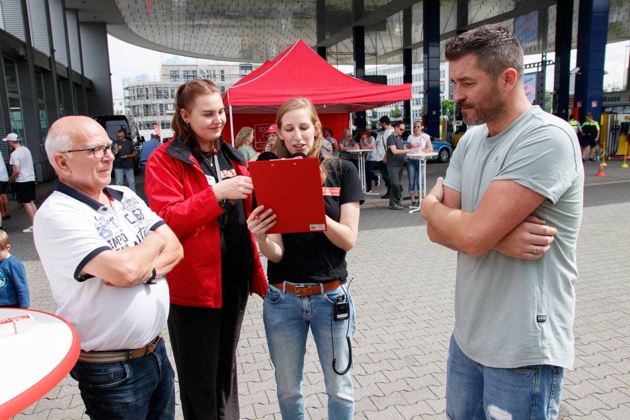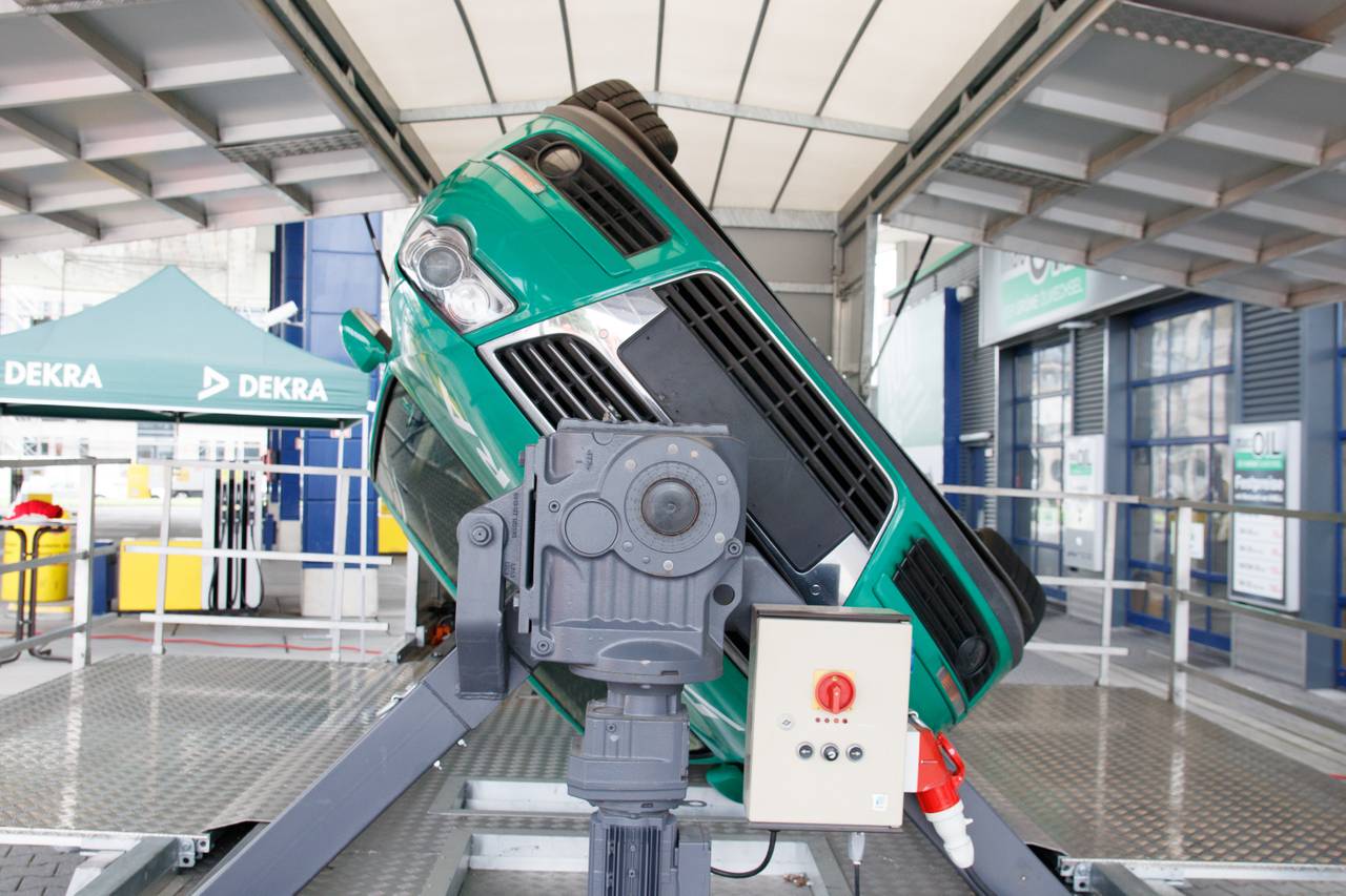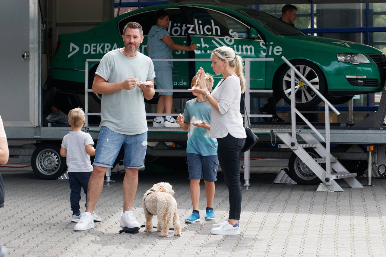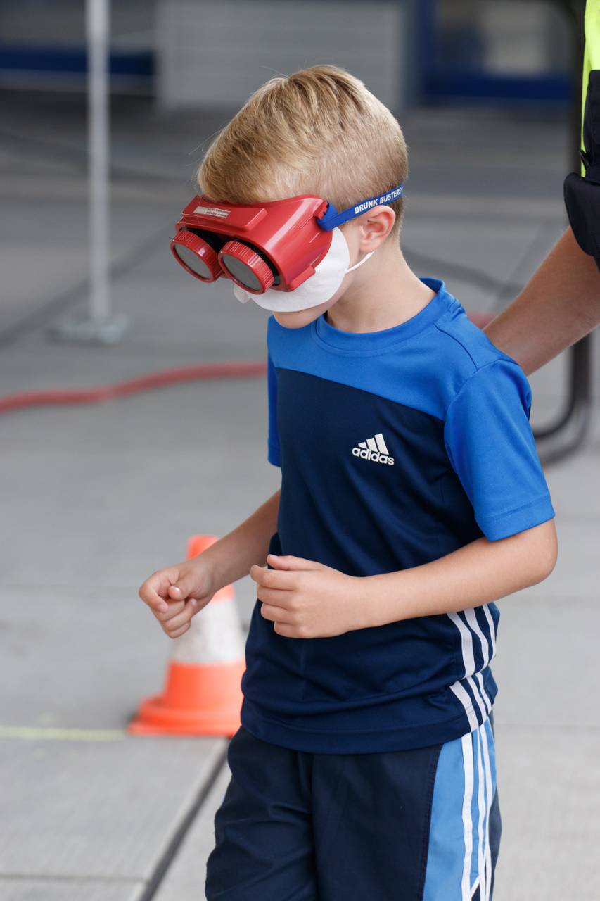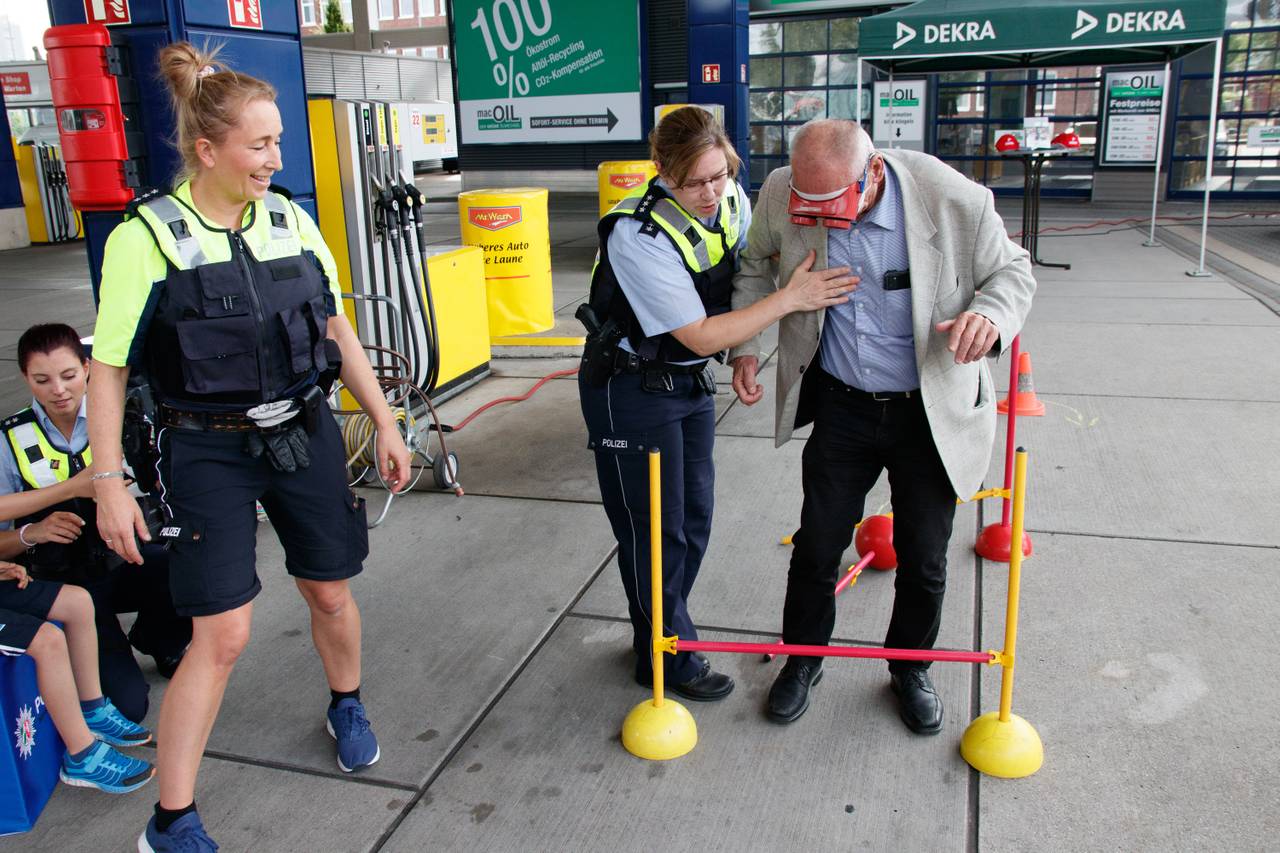 Neben der kostenlosen Autowäsche gab es auch Action beim Radio Essen-Verkehrsmeldertag. Mit der Unterstützung der DEKRA haben wir Euch testen lassen, wie es sich anfühlt, wenn ein Auto sich überschlägt. In einem Überschlagsimulator konnten sich unsere Verkehrsmelderinnen und Verkehrsmelder auf den Kopf drehen lassen. Michael aus dem Westviertel findet, dass der Simulator eine gute Abschreckung ist. Seine Kinder finden es besser als Achterbahn fahren. Außerdem hat die Polizei Essen einen Parcours aufgebaut. Der sah zwar einfach aus, musste aber mit einer bestimmten Brille durchlaufen werden. Die simuliert, wie es sich anfühlt, wenn man Alkohol getrunken hat.