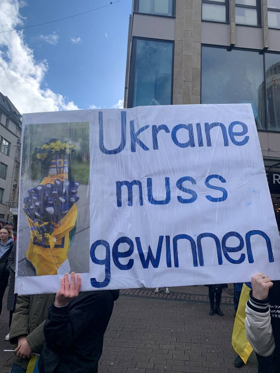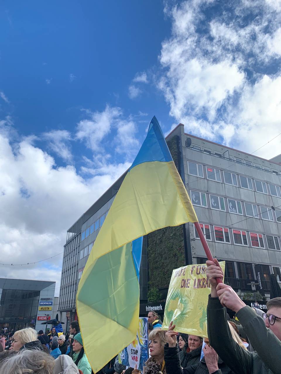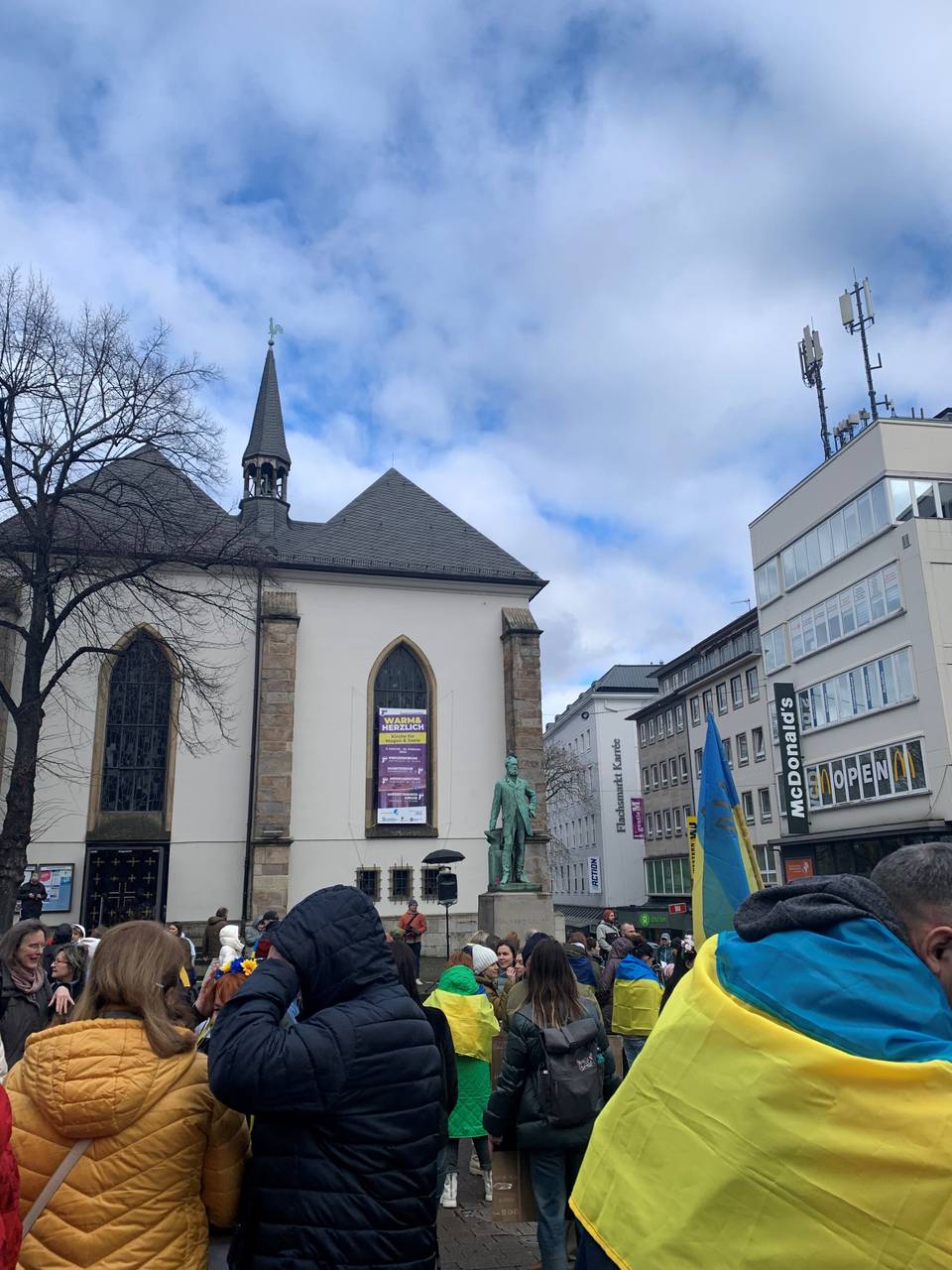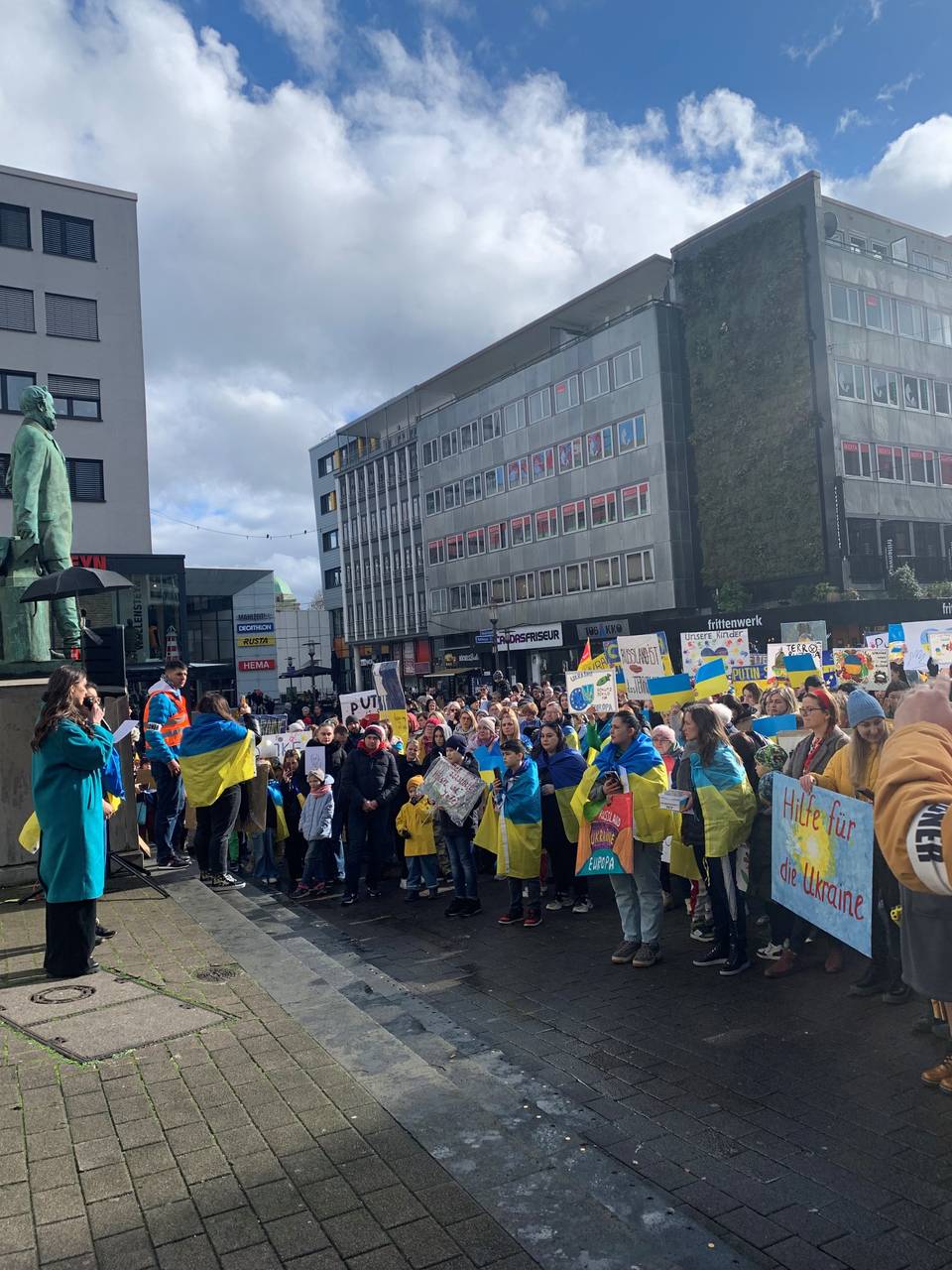 In Essen gab es am Samstagmittag, 24. Februar, eine Demonstration für die Ukraine. Etwa 500 Menschen sind vor die Marktkirche in der Innenstadt gekommen, um sich anlässlich des zweijährigen Kriegs in der Ukraine zu versammeln. So viele haben die Organisatoren auch vorab erwartet - trotzdem waren sie froh, dass so viele dann auch gekommen sind. Organisiert hat die Veranstaltung der Opora e.V. - zuerst gab es Reden für Frieden und Solidarität mit der Ukraine. Viele deutsch-ukrainische Essener und Essenerinnen waren da. Die Reden waren sowohl auf deutsch als auch auf ukrainisch. Einige Menschen trugen Blumengestecke und hatten Schilder gemalt wo zum Beispiel "die Ukraine blüht auf" zu lesen war. Gemeinsam gab es einen Demonstrationszug von der Marktkirche ausgehend über den Hauptbahnhof. Dann wurde sich erneut an der Marktkirche getroffen.
