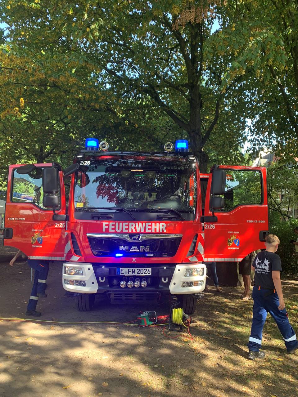 Wenn in Kupferdreh plötzlich viele mit einer Sonnenblume in der Hand rumlaufen, dann ist klar: Es ist wieder Sonnenblumenfest. In diesem Jahr hat das Stadtteilfest in Essen bestes Wetter erwischt. Bei bis zu 30 Grad gibt es eine kleine Kirmes mit Autoscooter, eine Hüpfburg und viele Mitmachaktionen. Einige Vereine und Verbände, wie der Festausschuss Kupferdreher Karneval, präsentieren ihre Arbeit und sammeln Spenden. Das Highlight für Jung und Alt ist aber, zumindest am Mittag, ganz klar die Feuerwehr Essen. Die präsentieren nämlich eines ihrer Feuerwehrautos. Für die meisten ist es beeindruckt, was da alles drin ist. Es gibt sogar die Möglichkeit, sich selbst mal reinzusetzen. Wer sich dann nicht wie ein kleiner Feuerwehrmann fühlt, der hat spätestens eine Station weiter die Möglichkeit dazu. Zusammen mit der Jugendfeuerwehr kann mit einem Löschschlauch ein Feuer, natürlich nur auf Tafeln die dann umklappen, in einem kleinen Haus gelöscht werden. Einige nutzen das auch einfach als kleine Abkühlung.