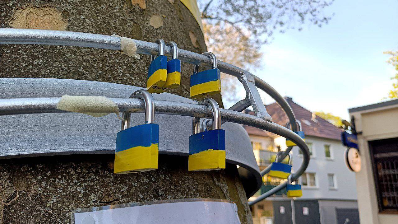 Ein Mann bei uns aus Essen hat sich eine besondere Spenden-Aktion für die Ukraine einfallen lassen: An einen Baum werden Vorhängeschlösser in den Farben der Ukraine angebracht. Das Geld für die Schlösser wird gespendet.