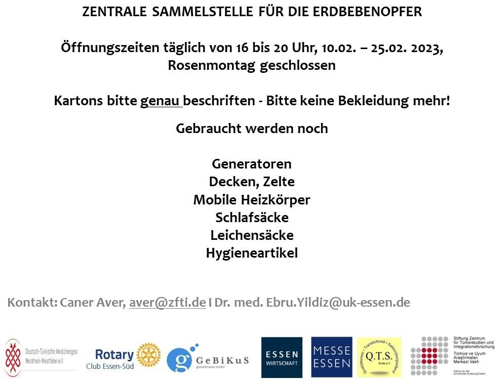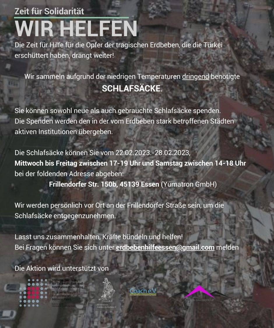 Die Spendenbereitschaft nach den Erdbeben bleibt in Essen hoch. Ein Zusammenschluss mehrerer Organisationen in Essen (u.a. Zfti, Antikes Antichioa e.V., Coach e.V. Ana-Tolia e.V.) sammelt weiterhin Schlafsäcke. Wer möchte, kann welche in die Yumatron GmbH nach Frillendorf bringen (Frillendorfer Straße 150b). Die Schlafsäcke werden dann von dort per Flugzeug in die Erdbebenregion gebracht.
