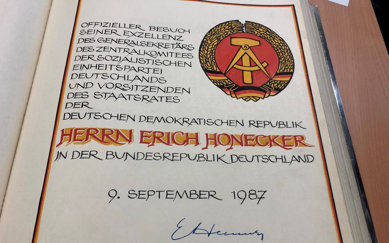 Unser Stadtreporter Kostas Mitsalis konnte einen Blick in das Stahlbuch der Stadt Essen werfen. Als der damalige Bundespräsident Joachim Gauck ins Stahlbuch geschrieben hat, fiel ihm auf: dass direkt hinter dem Eintrag vom Papst der Eintrag von Erich Honecker steht. Joachim Gauck wollte sich nach seinem Eintrag damals nur kurz die Seite des Papstes anschauen und blätterte eine Seite weiter. Als er den Eintrag von Erich Honecker gesehen hat, soll er leicht geschluckt und diplomatisch gelächelt haben.