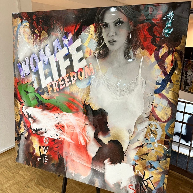 Eine Frau aus Essen mit iranischen Wurzeln, erotisch fotografiert und dann von einem Pop-Up-Künstler veredelt. Dieses Kunstwerk könnt Ihr ersteigern, der Erlös geht an die Frauenrechtler im Iran.