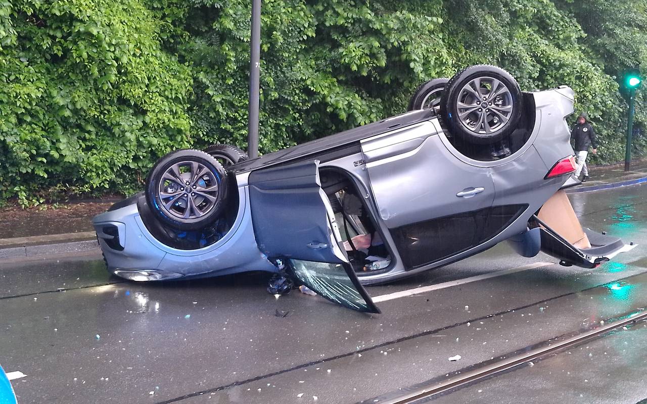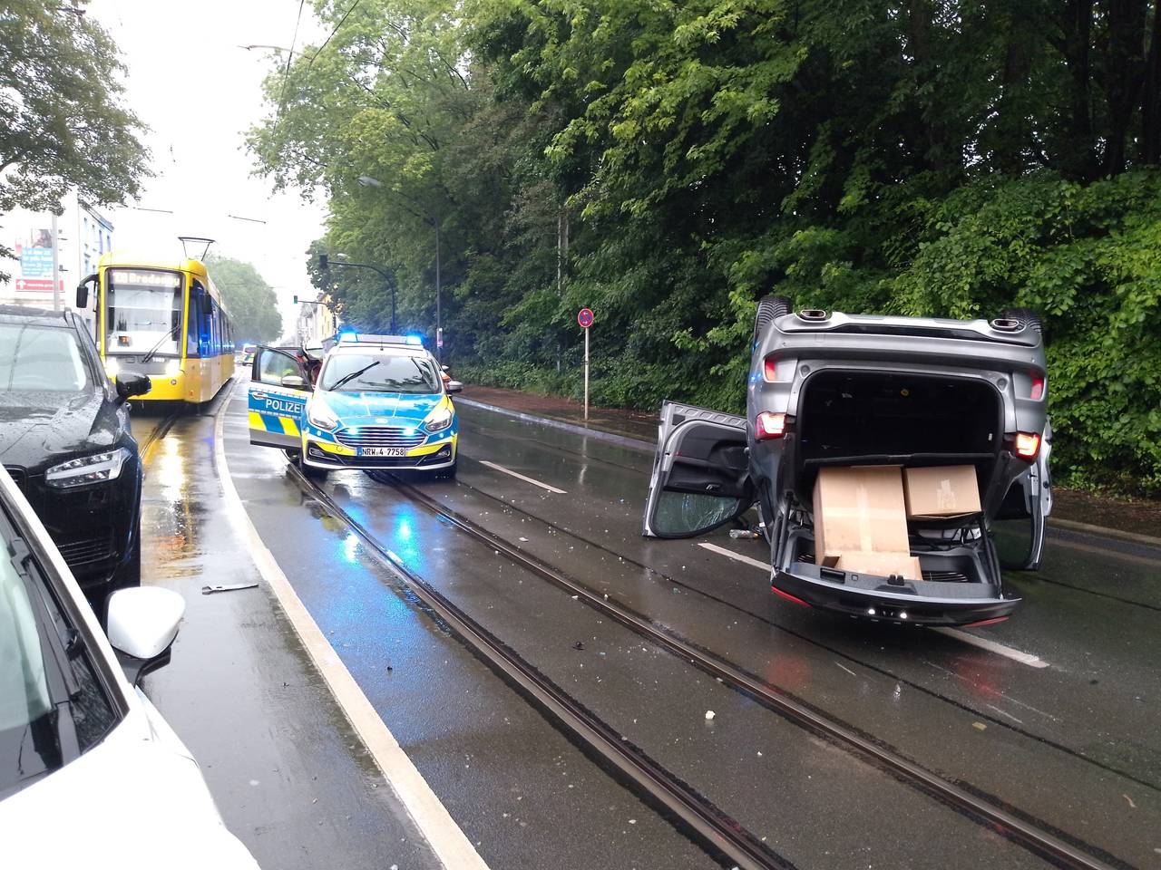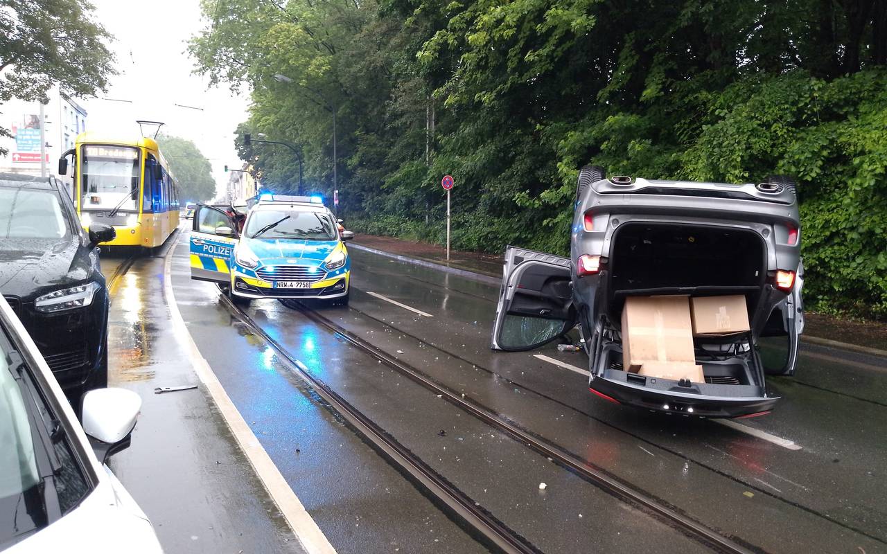 Auf der Altenessener Straße konnte ein Auto auf den regennassen Straßenbahnschienen nicht bremsen. Es kam zu einem Unfall mit mehreren Fahrzeugen, die Polizei meldet zwei Leichtverletzte, darunter sei auch ein Kind. Ein Auto landete auf dem Dach. Die Altenessener Straße war gesperrt, auch die Straßenbahnlinie 108 der Ruhrbahn kam nicht durch.