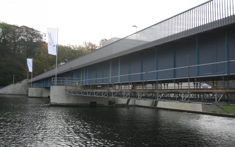 Das Stauwehr am Baldeneysee in Werden leuchtet am Freitagabend in Pink. Der Ruhrverband unterstützt damit eine Initiative zum Welt-Mädchentag.