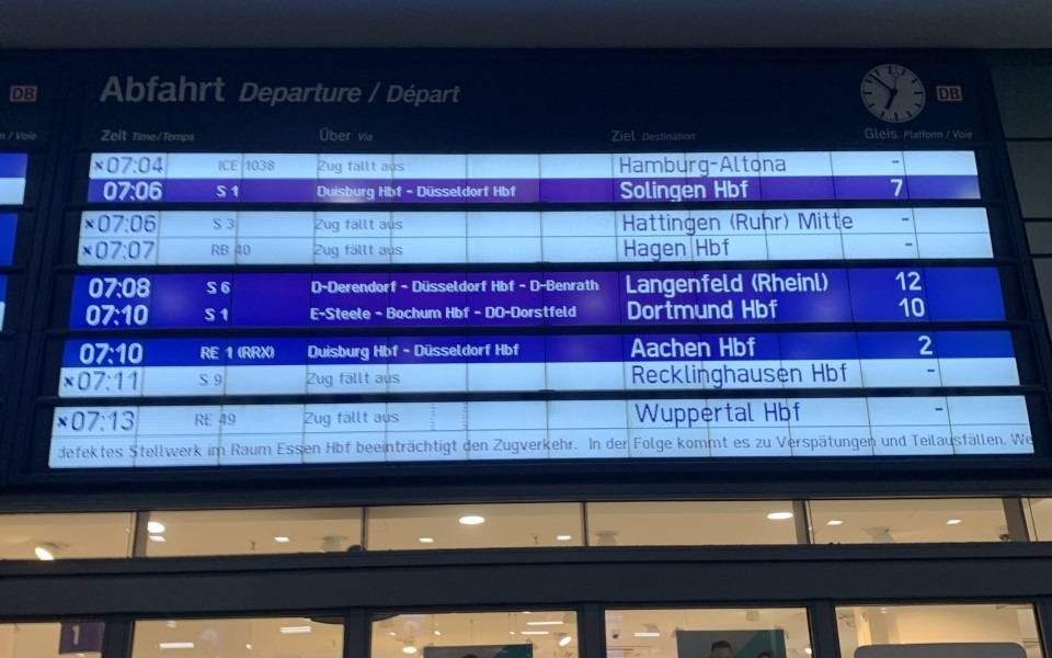 In Essen fallen am Donnerstagmorgen viele Züge aus. Seit der Nacht gab es eine technische Störung an einem Stellwerk. Sie ist seit kurz vor 8 behoben. Trotzdem kommt es noch zu Verspätungen.