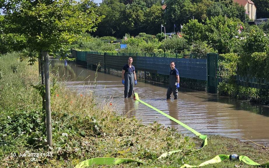 Die Feuerwehr Essen pumpt am Tag nach dem Unwetter (10. Juli) eine Kleingartenanlage leer. Viele Lauben standen komplett unter Wasser und sind jetzt Schrott. Der Schock über die plötzlichen Wassermassen sitzt tief bei den Kleingärtnern.