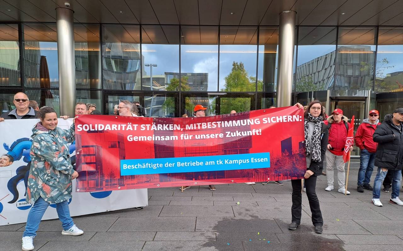 Die Beschäftigten des Essener Konzerns Thyssenkruppp haben am Donnerstagmorgen (12. September) im Westviertel protestiert. Sie haben Angst um ihre Arbeitsplätze. Durch eine geplante Umstrukturierung, den Verkauf oder die Schließung von Standorten könnten Beschäftigte ihren Job verlieren, sagen sie. Deswegen haben sie sich am Donnerstag gegen 8 Uhr vor der Konzernzentrale im Westviertel versammelt und in die Zufahrten gestellt: Am Donnerstagmittag treffen sich die Aufsichtsräte, darunter auch Aufsichtsratschef Russwurm und der Thyssenkrupp-Chef Miguel López. Sie wollen weiter über die geplante Umstrukturierung beraten.