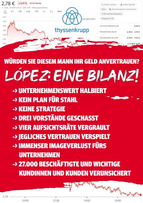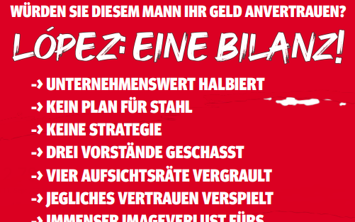 Die Mitarbeitenden wollten ein Zeichen setzten. Rund 150 Menschen aus Duisburg, Dortmund, aber auch aus Essen sind zu dem Protest gekommen. Sie wollten die Chefs nicht ernsthaft daran hindern, auf das Gelände zu kommen, sagt ein Mitglied aus dem Konzernbetriebsrat auf Radio Essen-Nachfrage. Aufsichtsratschef Russwurm sei wortlos an den Protestierenden vorbeigelaufen, erzählt er weiter. Von vielen Beschäftigten gab es natürlich Zuspruch. Sie hatten Banner aufgehängt und ein Flugblatt verteilt, auf dem steht: "Würden Sie diesem Mann Ihr Geld anvertrauen?" Erst vor wenigen Wochen hatte es einen großen Knall bei der Stahlsparte von Thyssenkrupp gegeben. Mehrere Mitglieder haben in Duisburg wegen Differenzen mit Chef López den Aufsichtsrat der Stahlsparte verlassen, unter anderem der ehemalige Vize-Kanzler Sigmar Gabriel.