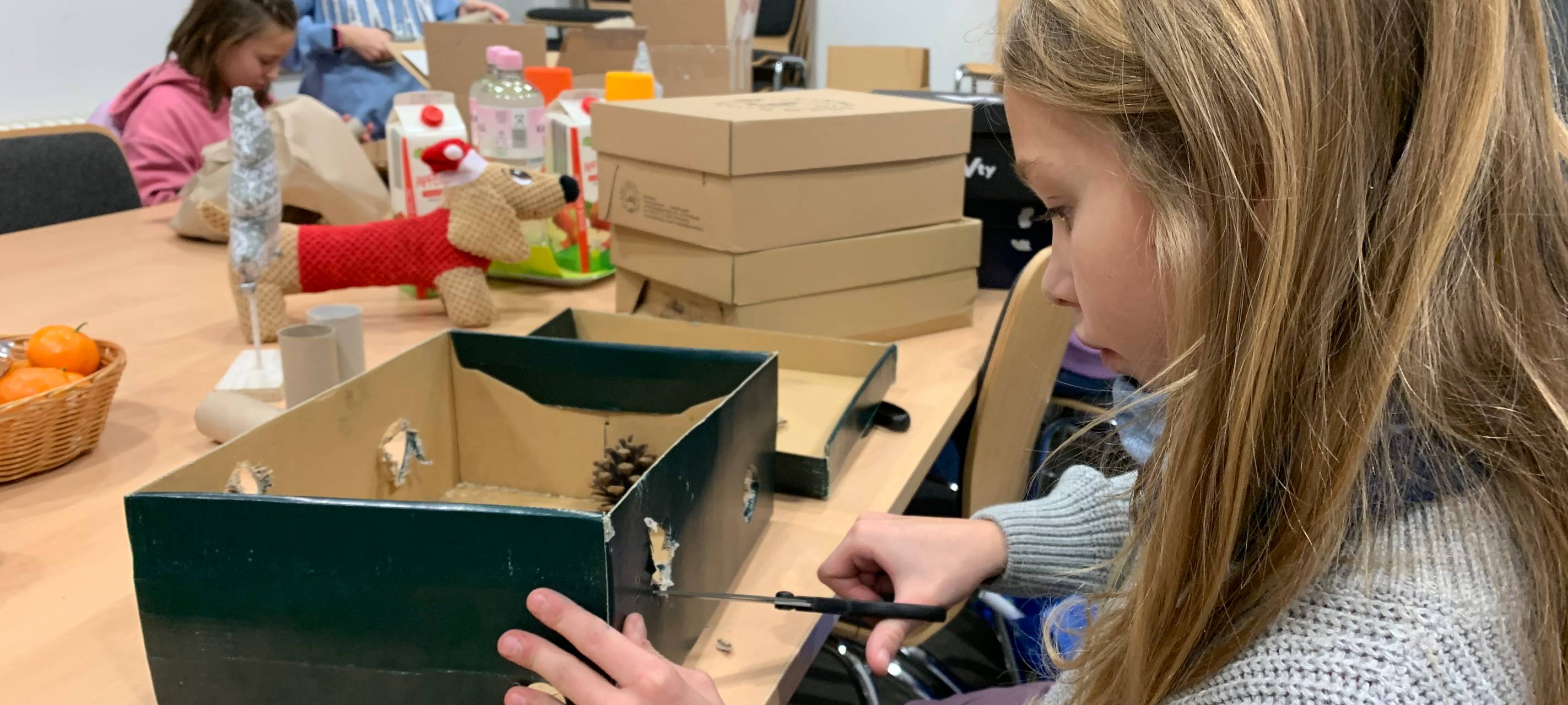 Beim gemeinsamen Basteln sind kleine Futterboxen und Beschäftigungs-Spielezeuge entstanden. Die Kinder haben zum Beispiel aus alten Eierkartons Gemüsekartons mit Löchern gebaut, aus denen die Tiere ihr Futter herausfischen können. Die entstandenen Boxen durften die Kinder im Anschluss selber in die Tiergehege bringen. Das Staunen war groß, als sich die kleinen Nagetiere sofort auf die Futterboxen gestürzt haben.