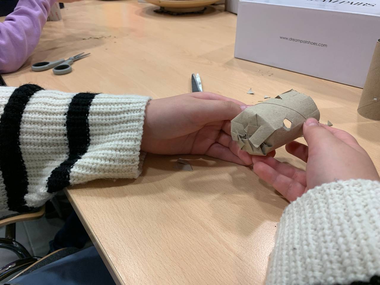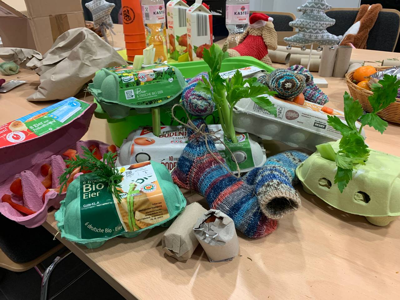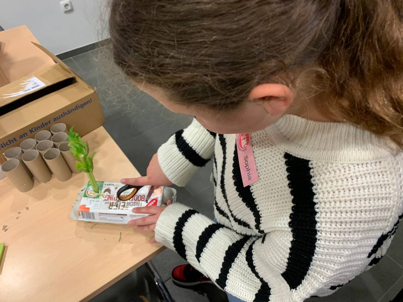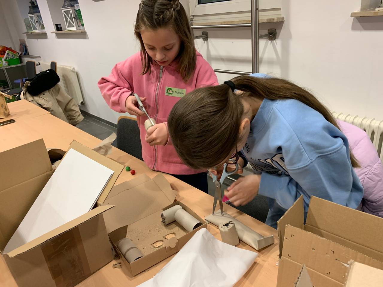 Beim gemeinsamen Basteln sind kleine Futterboxen und Beschäftigungs-Spielezeuge entstanden. Die Kinder haben zum Beispiel aus alten Eierkartons Gemüsekartons mit Löchern gebaut, aus denen die Tiere ihr Futter herausfischen können. Die entstandenen Boxen durften die Kinder im Anschluss selber in die Tiergehege bringen. Das Staunen war groß, als sich die kleinen Nagetiere sofort auf die Futterboxen gestürzt haben.