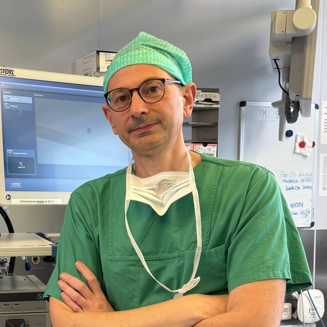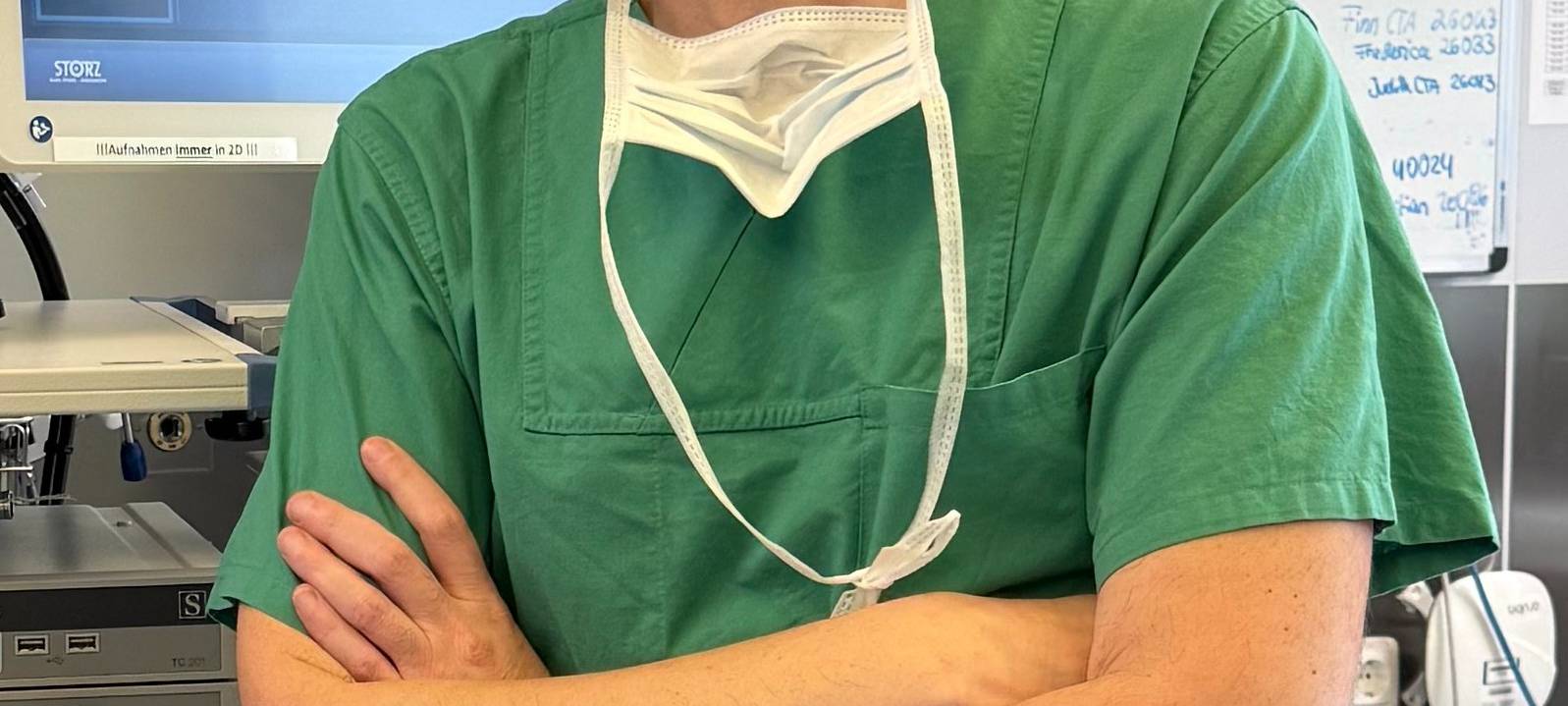 Dr. Pier Francesco Alesina kommt gerade aus dem OP. Im grünen Kasack, die Haare unter einer OP-Haube, der Mundschutz hängt locker an seinem Hals herunter. Die Operation sei lang und komplex gewesen, sagt er im Radio Essen Interview.