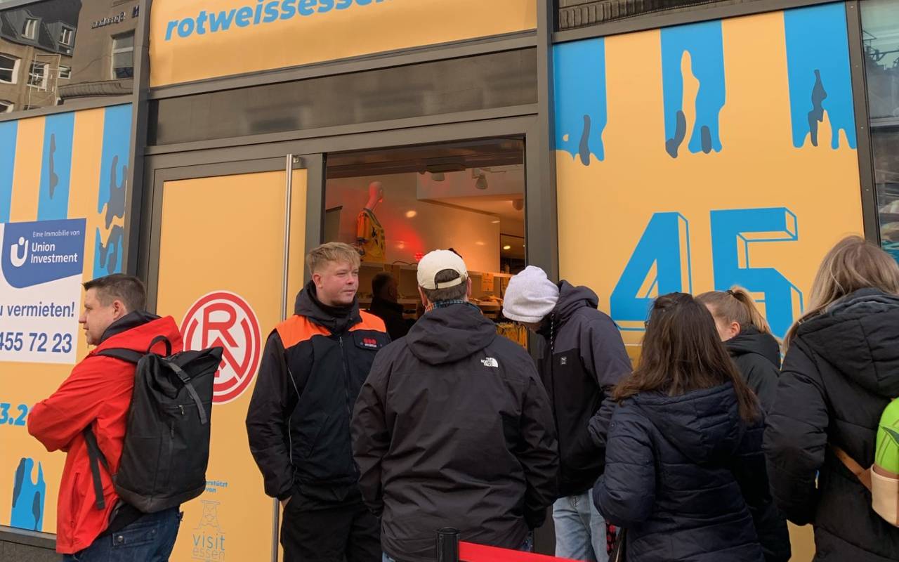 Der Trikotverkauf von Rot-Weiss Essen und der Social Media-Seite essendiese ist am heutigen Donnerstag (29.2.) gestartet. Bereits am frühen Morgen gab es direkt eine lange Schlange auf der Kettwiger Straße.