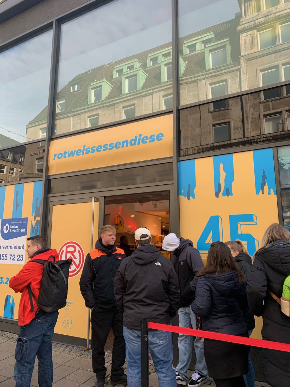Das heiß ersehnte Trikot von Rot-Weiss Essen und essendiese ist da. Der Verkauf ging am Donnerstagmorgen (29.2.) um 10 Uhr im Pop-up-Laden auf der Kettwiger Straße in der Innenstadt los. Schon bevor die Türen aufgegangen sind, standen hunderte Menschen in der Schlange vor dem Shop. Sogar Campingstühle waren dabei. Kurz vor zehn ging die Schlange schon bis zum Hauptbahnhof.