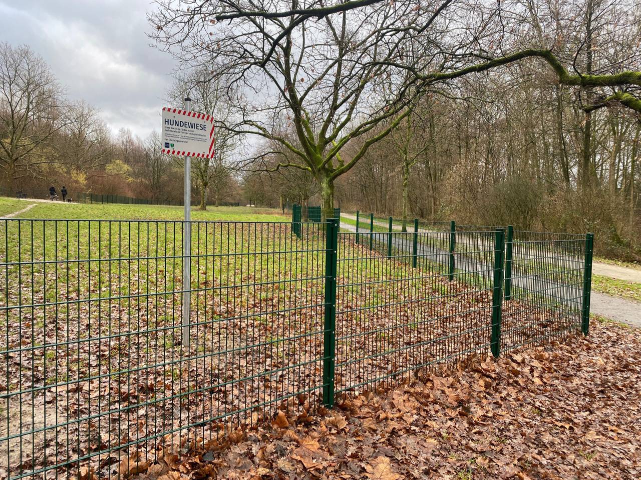 Die neu eingezäunte Hundewiese in Essen-Freisenbruch hat ein Problem. Kleinere Hunde passen unter das Eingangstor und können auf die Straße laufen.
