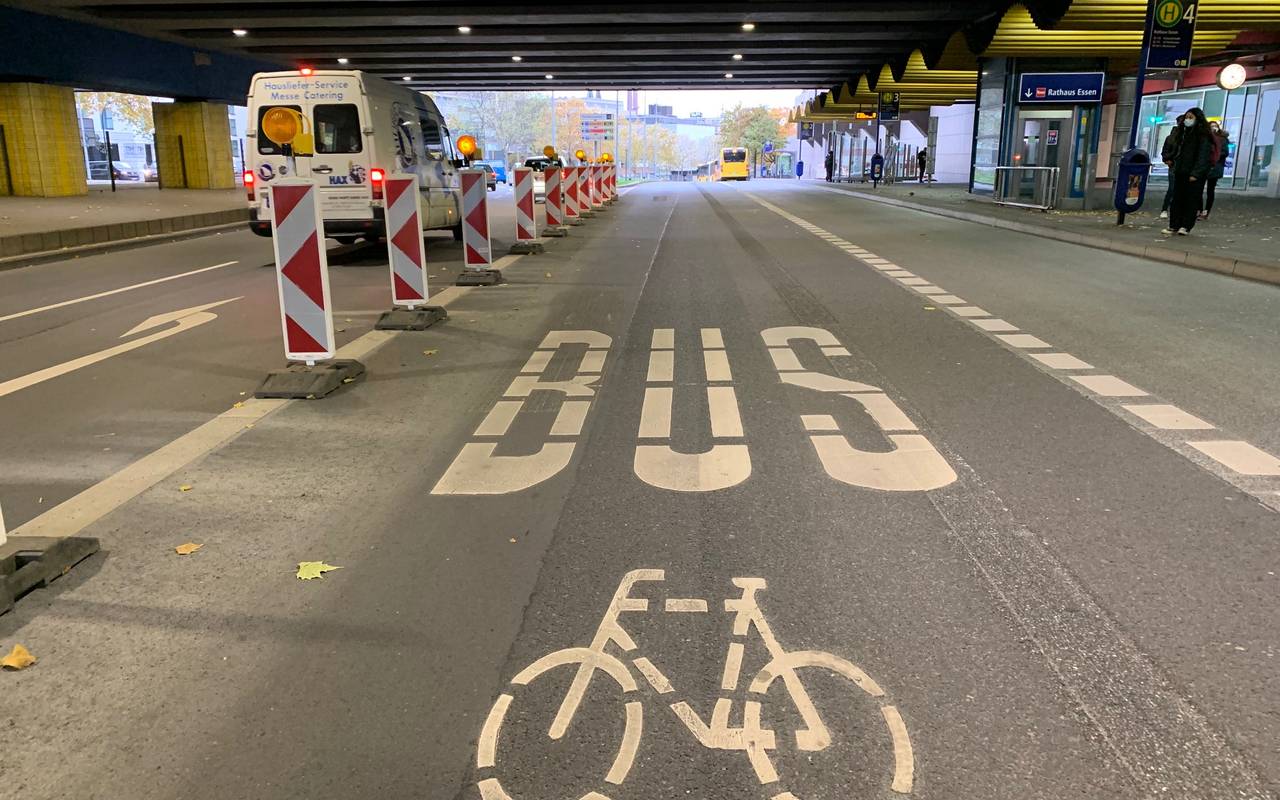 Die neue Umweltspur im Ostviertel von Essen ist jetzt fertig. Am Dienstag (27. Oktober 2020) wurde sie eröffnet. Auf einem 300 Meter langen Stück der Schützenbahn dürfen auf der rechten Spur nur noch Busse und Fahrräder fahren, Autos dürfen die Spur nicht benutzen.
