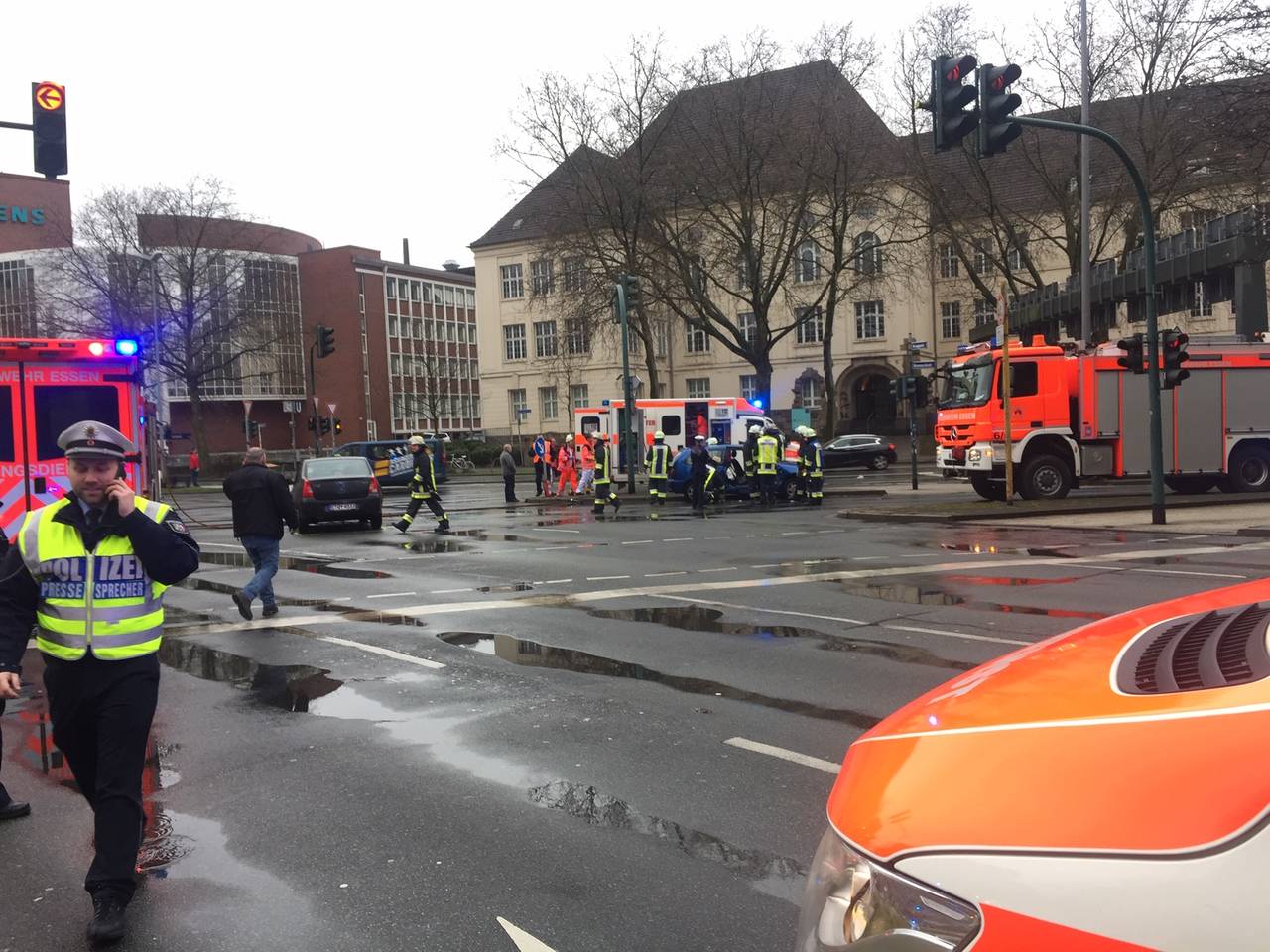 An der Kreuzung der Hindenburgstraße mit der Kruppstraße in Essen-Innenstadt gab es am Freitag (3. Januar) einen schweren Unfall. Zwei Autos sind beim Abbiegen zusammengestoßen. Der Unfall war genau in der Mitte der Kreuzung. Zwei Frauen wurden verletzt ins Krankenhaus gebracht. Die Polizei rekonstruiert den Unfallort mit einem 3D-Scanner. Zeitweise war die Kreuzung größtenteils gesperrt. Um circa 12.40 Uhr wurden Teile der Kreuzung wieder freigegeben. Nach derzeitigem Stand ist Kruppstraße in Richtung Innenstadt wieder frei. In Richtung Holsterhausen müssen Autofahrer einen Umweg fahren. Die Bismarckstraße ist in Richtung Innenstadt weiter gesperrt. Das gilt auch für den Linksabbieger zur A40.