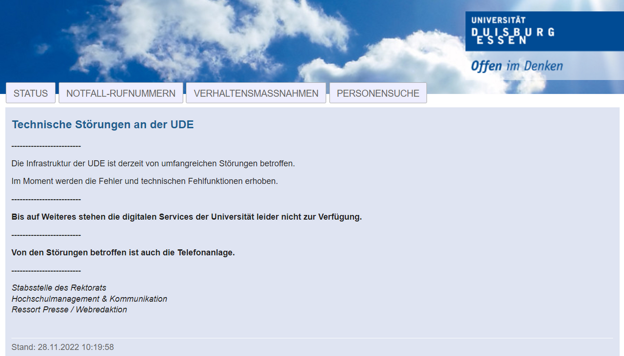 Die Universität Duisburg-Essen meldet aktuell eine massive technische Störung. Davon sind auch die digitalen Services sowie die Telefonanlage der Uni betroffen. Jetzt ist der Grund dafür bekannt.