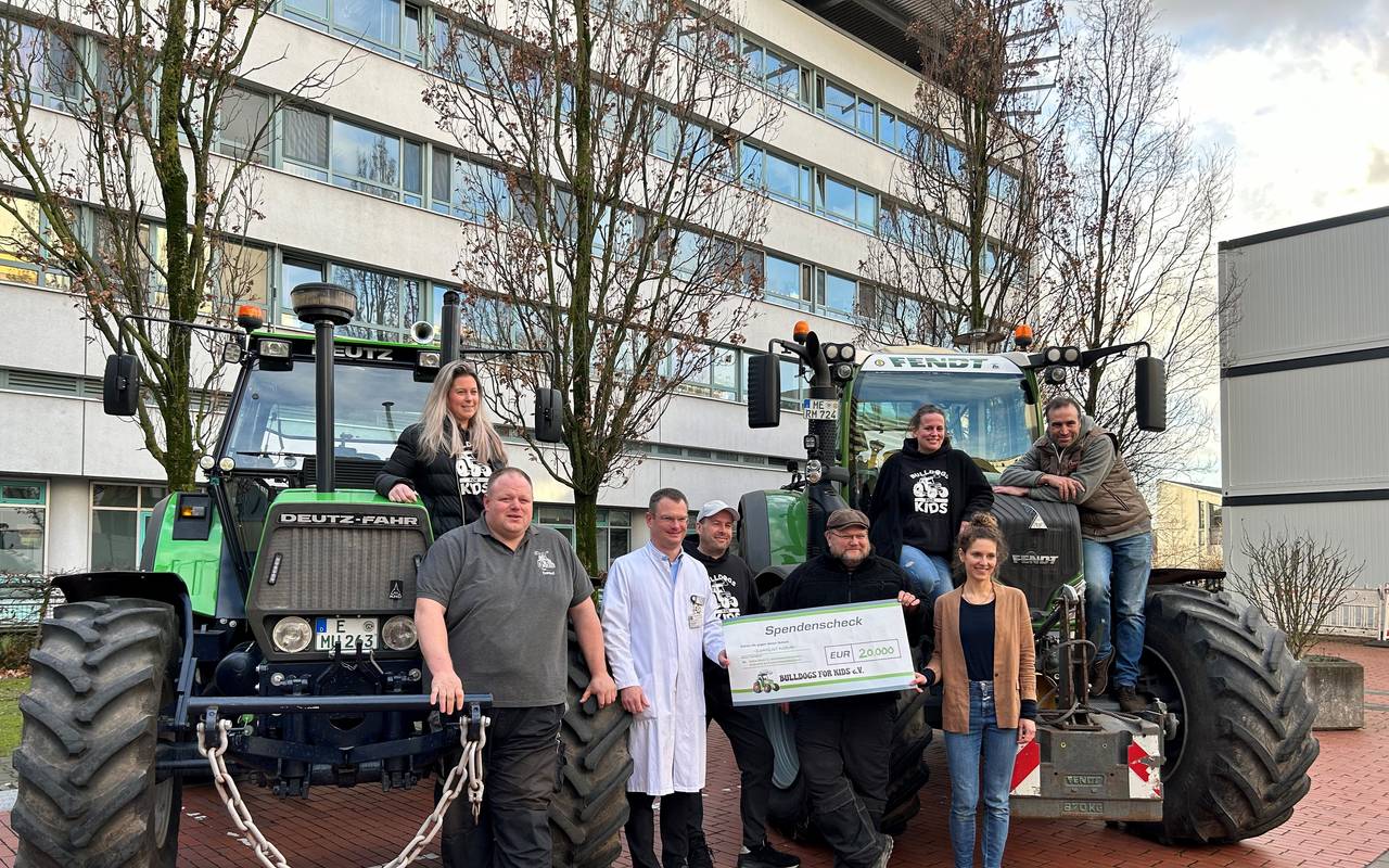 Zum Verein Bulldogs for Kids gehören einige Landwirte aus Essen und Umgebung. Sie sammeln schon seit Jahren mit unterschiedlichen Events Spenden. In diesem Jahr haben sie in der Vorweihnachtszeit mehrere Trecker-Rundfahrten mit ihren weihnachtlich geschmückten Treckern gemacht. Eine führte durch Freisenbruch, Kray, Steele bis nach Überruhr, eine weitere durch Kettwig, Werden bis nach Heidhausen. Die Vereinsmitglieder veranstalten aber auch Weihnachtsfeiern und liefern Weihnachtsbäume mit weihnachtlich geschmückten Treckern aus und sammeln dabei Spenden. Neben den 20.000 Euro für die Kinderklinik spendet der Verein noch 2500 Euro für unsere Aktion Lichtblicke.