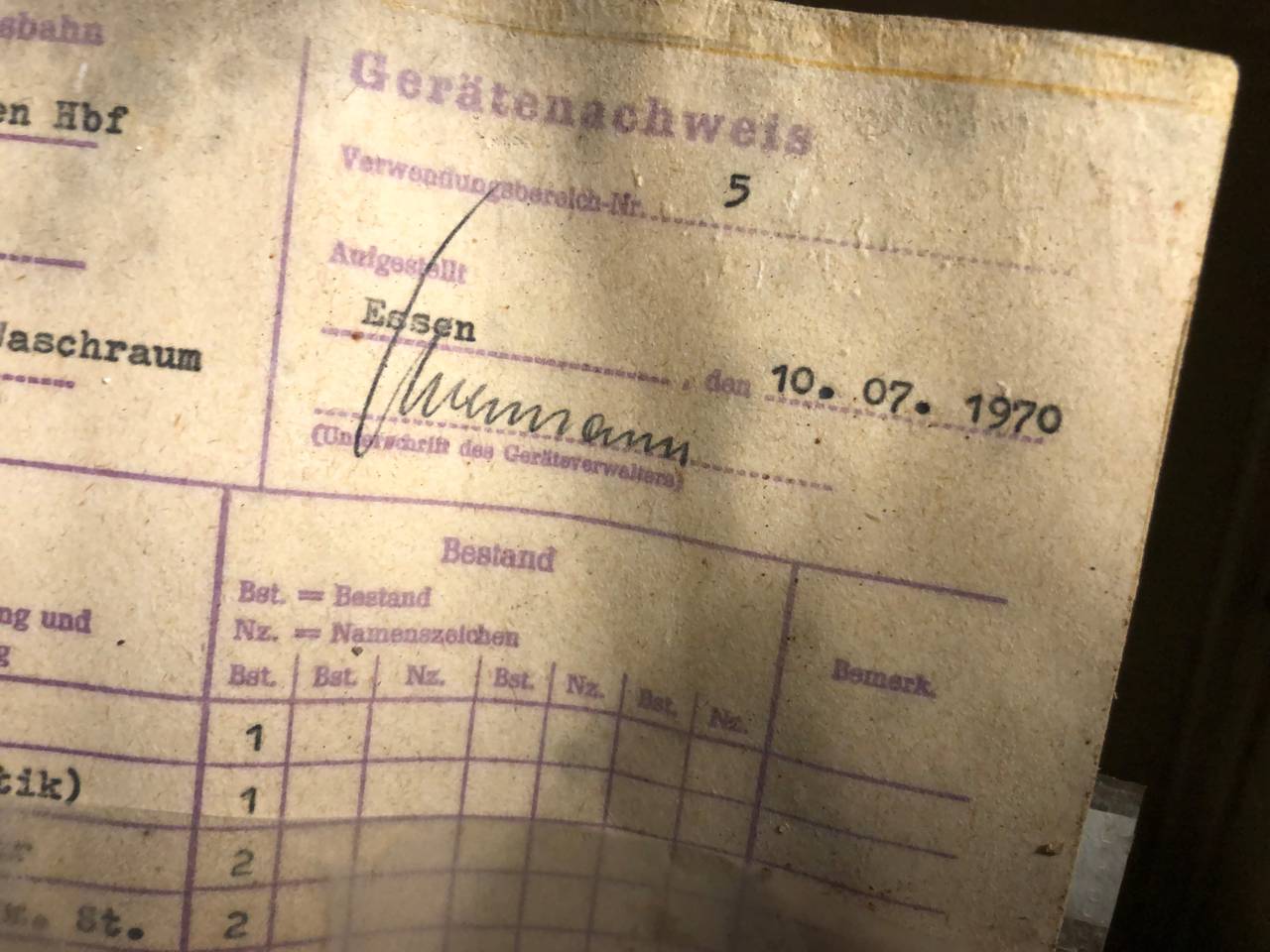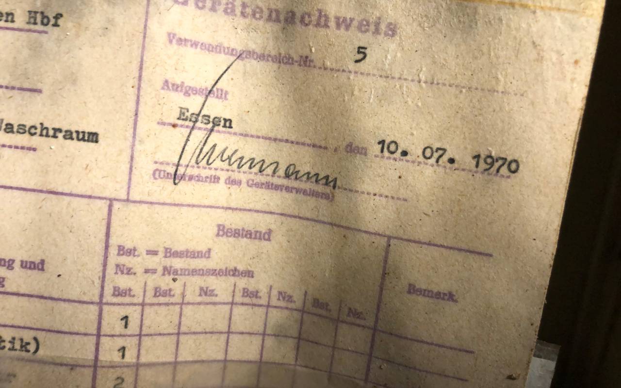 Spuren auf dem Boden des Bunkers in Essen zeigen, dass hier regelmäßig der Ernstfall geprobt wurde. Der Boden ist an einigen Stellen völlig abgenutzt. Im ehemaligen Badezimmer hängt noch ein Kontrollzettel von der letzten Reinigungskontrolle. Am 10.07.1970 hat ein penibler Bahn-Kontrolletti sich noch vergewissert, dass die Klos und die Badezimmer sauber sind.