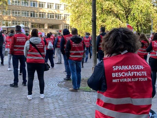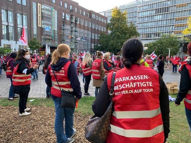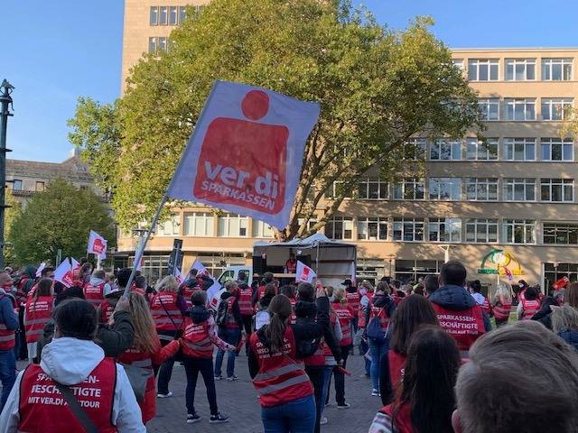 Die Warnstreiks im öffentlichen Dienst haben heute zum ersten Mal auch Auswirkungen in Essen. Die Gewerkschaft Verdi hat die Mitarbeiter der Sparkasse zum Streik aufgerufen. Er soll heute den ganzen Tag dauern. Einige Filialen blieben geschlossen, andere haben aber auch geöffnet. Am Vormittag gab es eine Kundgebung der Streikenden auf dem Hirschlandplatz.