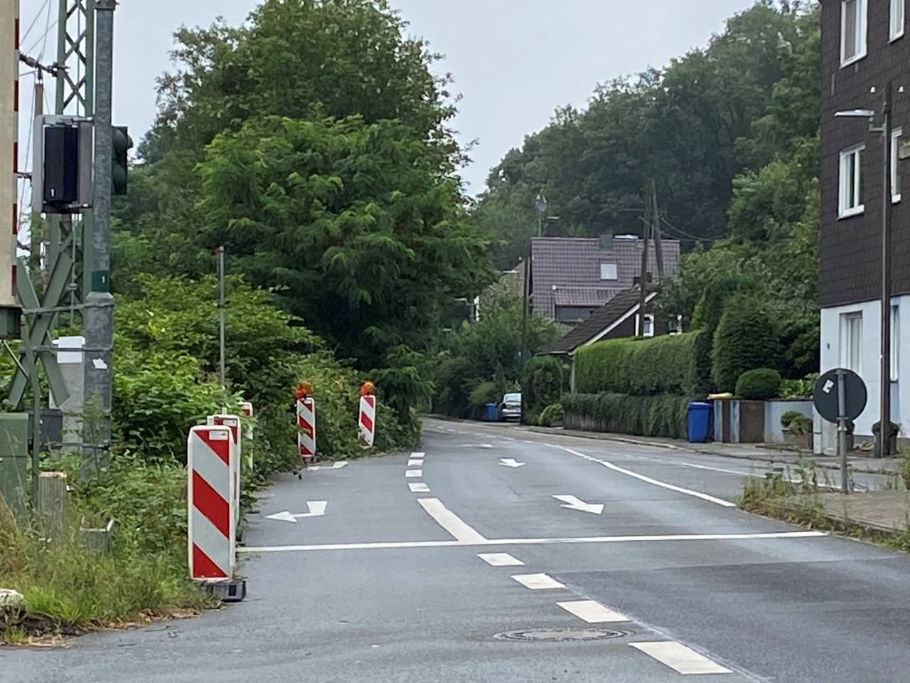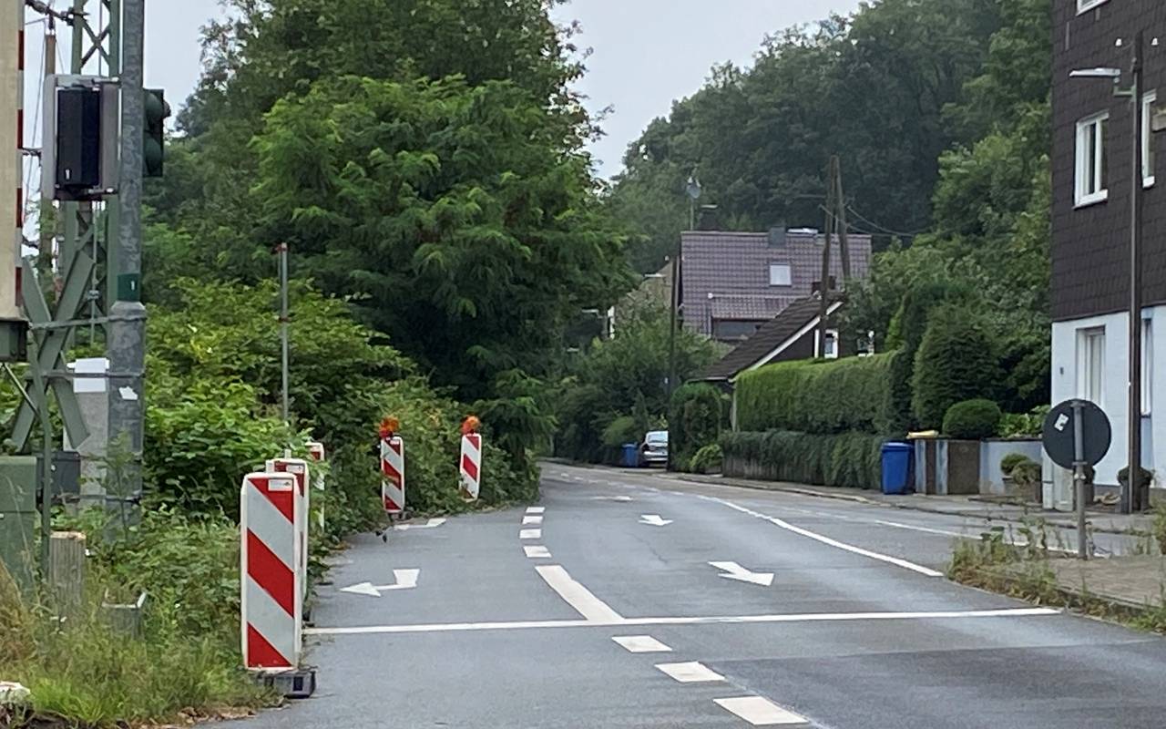 Die S9 fährt aktuell nicht zwischen Steele und Wuppertal. Der Grund ist das Hochwasser des Deilbachs. Der ist Mitte Juli zu einem reißenden Fluss geworden und über die Ufer getreten und hat große Teile der S-Bahnstrecke zerstört. Deshalb fahren zwischen Steele und Wuppertal Hbf aktuell Busse nach diesem Fahrplan. Die Busse halten aber in Richtung Wuppertal nicht direkt am S-Bahnhof Überruhr. Dort ist die Langenberger Straße einfach zu eng, sagt Betreiber Abellio. Es gibt keinen Fußweg und keinen Platz, an dem der Bus halten könnte. Abellio erklärt auf Radio Essen-Nachfrage, aus Sicherheitsgründen kann dort keine Haltestelle eingerichtet werden. Dort sieht es so aus.