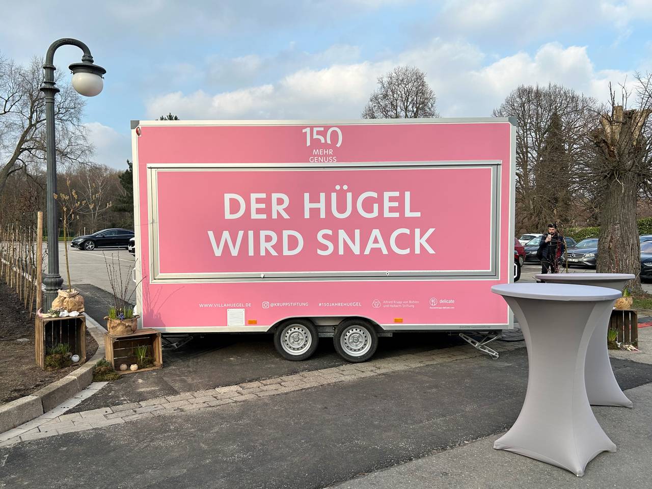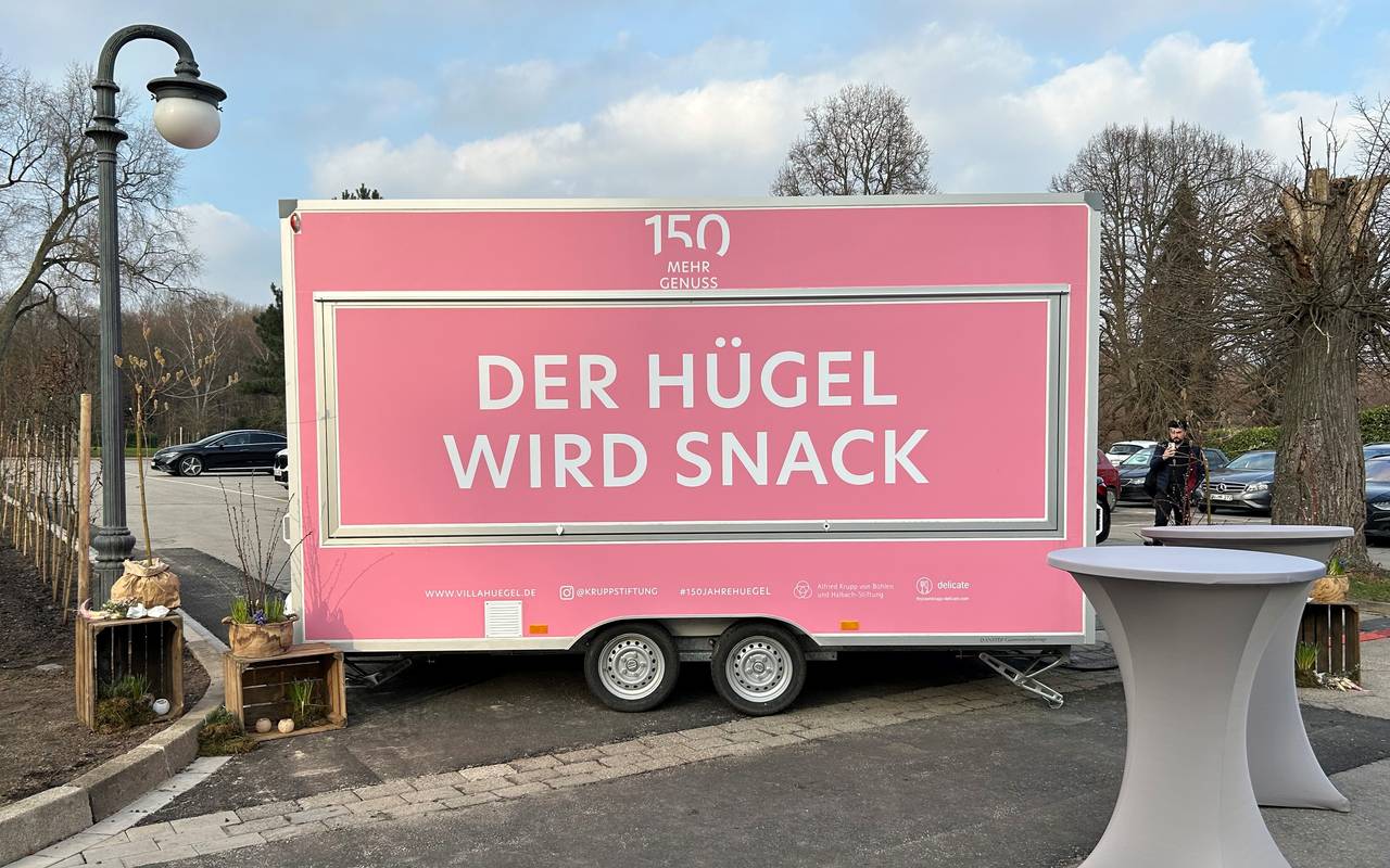 Im Jubiläumsjahr der Villa Hügel wird es zahlreiche Veranstaltungen in Essen geben. Zuerst eine Video-Sound-Installation. Die wird am Freitagabend (10.02.) als erstes in Anwesenheit von Frank-Walter Steinmeier gezeigt. Die Installation setzt sich aus historischem Material zusammen, das von den Künstler-Duo joeressen+kessner verfremdet und bearbeitet wurde. Es flüstert und dröhnt vor der Villa Hügel. Damit Besucherinnen und Besucher auch etwas zu Essen und zu Trinken bekommen, steht jetzt sogar ein Foodtruck vor der Villa. Dort gibt es Kaffee und Kuchen so wie ihn früher schon die Familie Krupp gegessen hat.