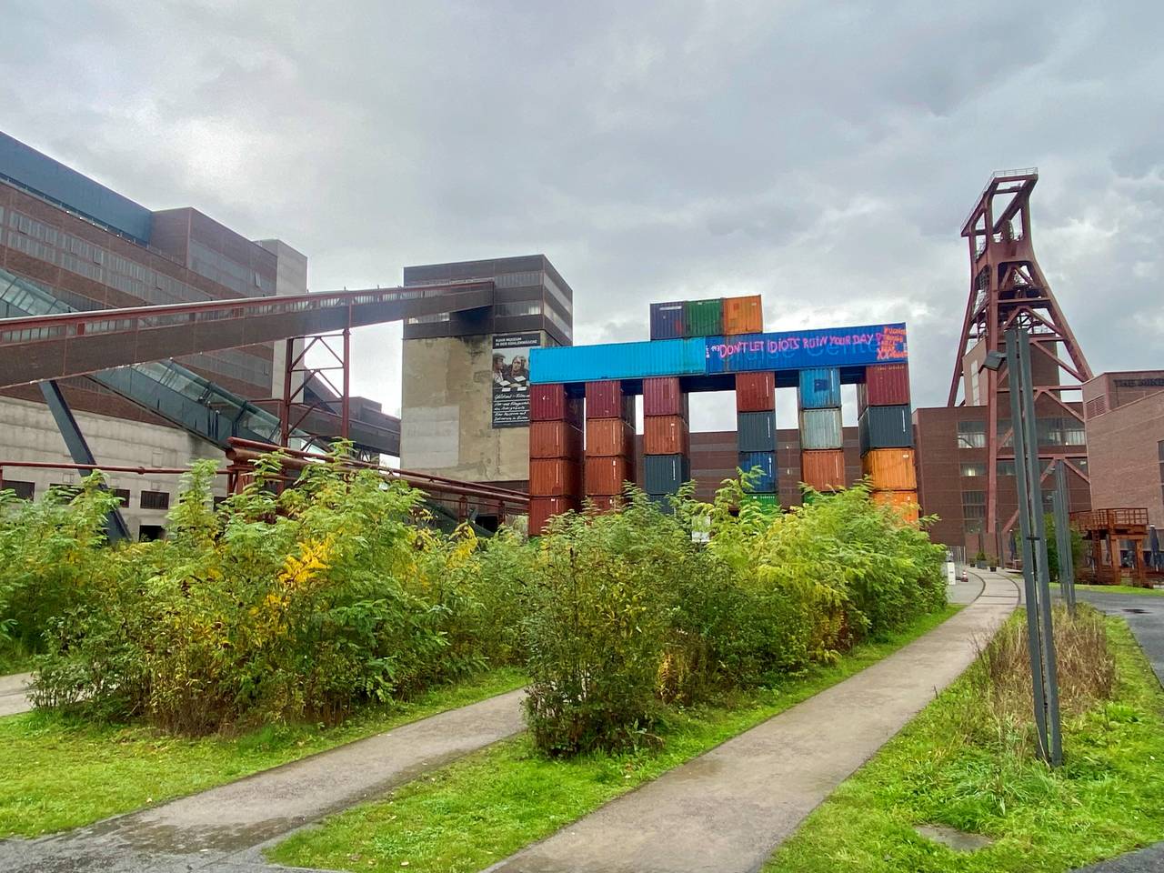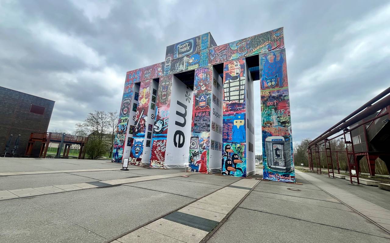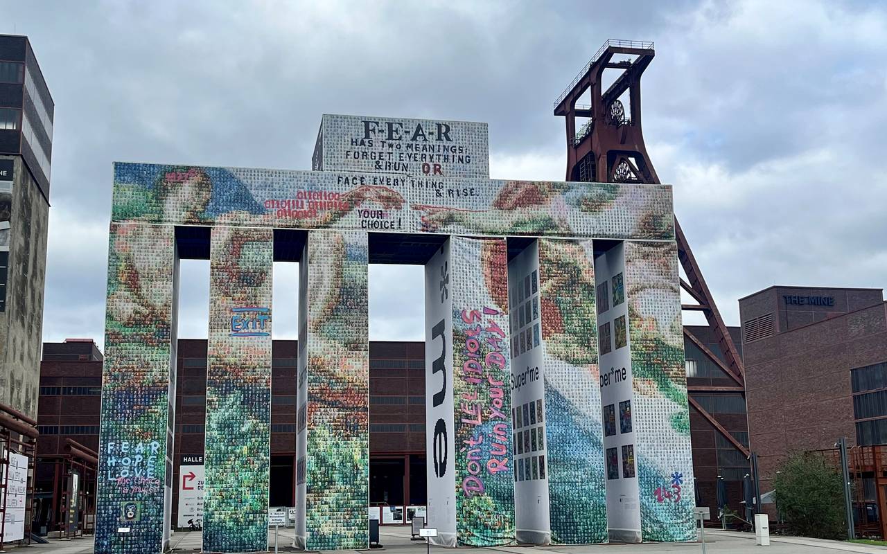 Viele kamen nach Essen, um das Kunstwerk zu sehen und besuchten danach auch das Ruhr Museum oder die Kokerei auf Zollverein. Wer in diesem Winter Zollverein besucht hat, konnte das aus Containern nachgebaute Brandenburger Tor nicht übersehen. Der Standort neben dem Doppelbock und der orangefarbenen Rolltreppe war optimal gewählt. Das sogenannte Global Gate in Originalgröße des Brandenburger Tors war schon vom Parkplatz sehr gut zu sehen. Über den 37 Seecontainern wurde eine stabile LKW-Plane gespannt. Der Künstler Thomas Wirth, bekannt als Super*me, hat die bunte Folie gestaltet und mit QR-Codes versehen. Wer die Codes mit dem Handy scannt, bekommt Clips über Demokratie oder über KI zu sehen. Damit hat der Künstler versucht, spielerisch Inhalte zu vermitteln. Vor allem die Jüngeren haben die QR-Codes gescannt. Die Älteren waren vor allem von der Größe des Objekts beeindruckt.