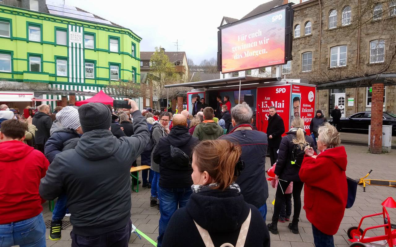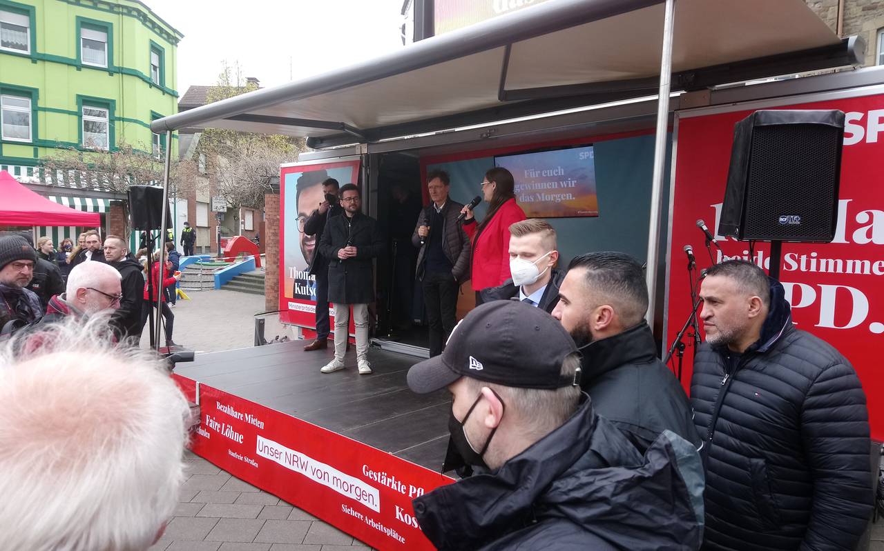 Auch Thomas Kutschaty aus Essen-Schönebeck, der Ministerpräsident werden möchte, hat sich in einer Rede an die Menschen auf dem Kupferdreher Markt gewandt.