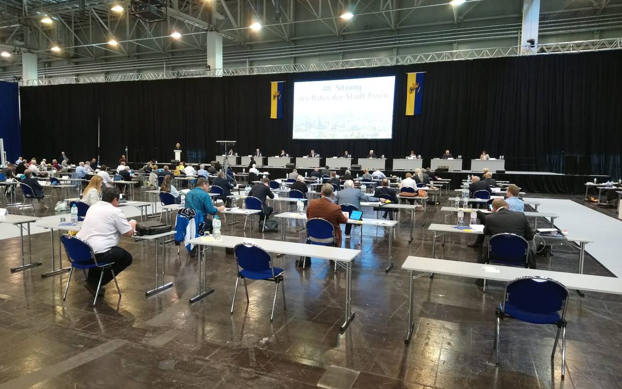 Es sieht durchaus schick aus in der Halle 5 der Messe Essen: Der Tagungsbereich ist mit großen Vorhängen abgehängt, am Eingang läuft man über einen langen weißen Teppich, Mitarbeiter des Ordnungsamtes sorgen dafür, dass alles reibungslos und gemäß der Corona-Regeln funktioniert. Die letzte Ratssitzung ist mehr als drei Monate her, zur Eröffnung hat Oberbürgermeister Thomas Kufen heute eine Rede gehalten. "Es fühlt sich ein bisschen so an, wie bei einer Hauptversammlung von RWE oder EON", hat er gesagt, als er in die weite Messehalle geschaut hat. Alle sitzen weit auseinander und man muss schon genau hinsehen, wer gerade weit weg am Rednerpult steht. Die Stadt ist handlungsfähig und es geht weiter, das ist hier auch eine Botschaft.