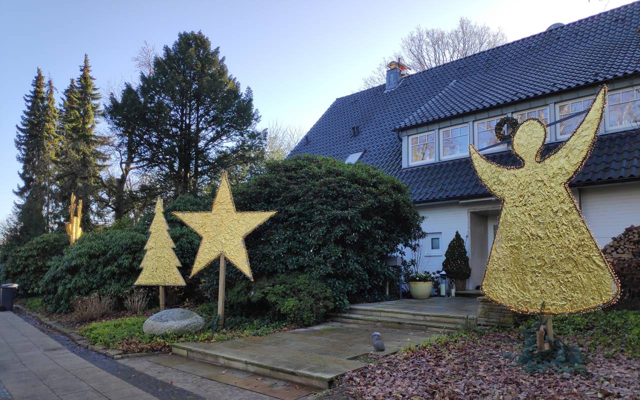 Auch in Bredeney haben viele Anwohner ihre Häuser weihnachtlich geschmückt. In einem Vorgarten am Reckmannshof stehen vier mehrere Meter hohe, goldene Weihnachtsfiguren, die auch im Dunklen leuchten: Ein Rentierkopf, eine Tanne, ein Stern und ein ungefähr drei Meter hoher Engel. Das sieht ziemlich beeindruckend aus und war auch bestimmt viel Arbeit.